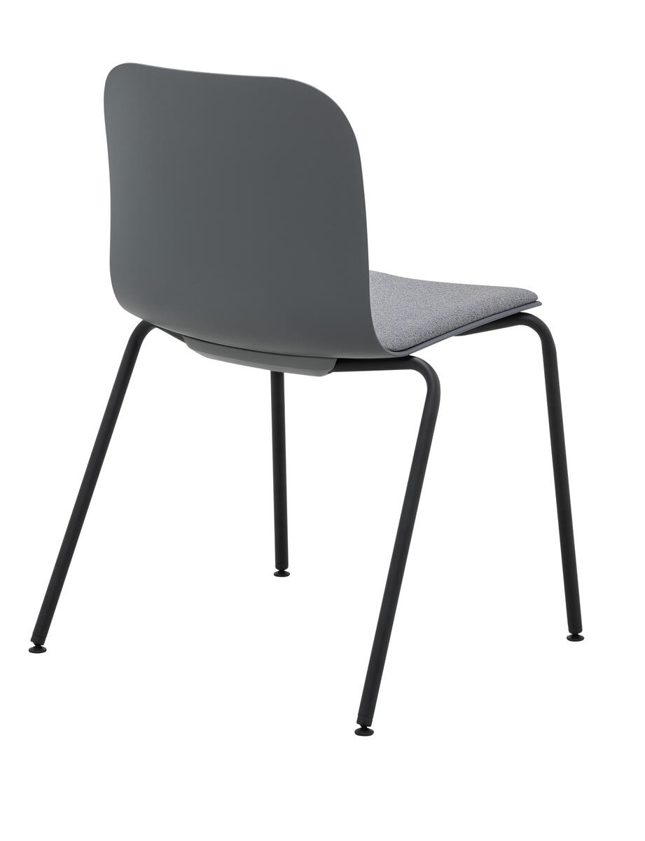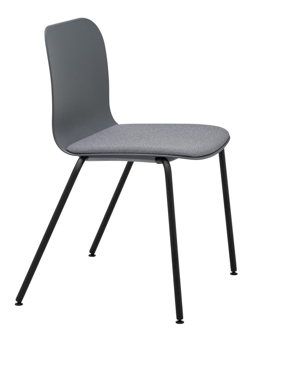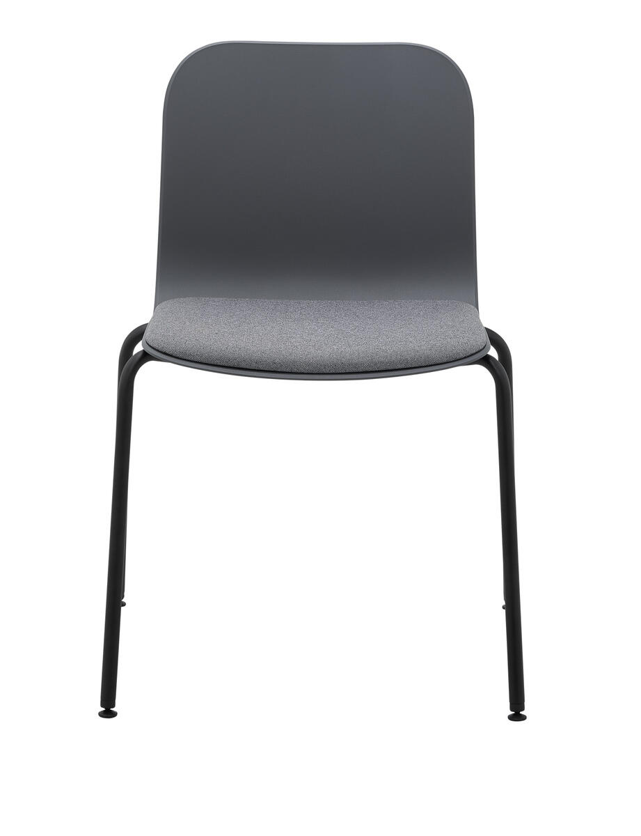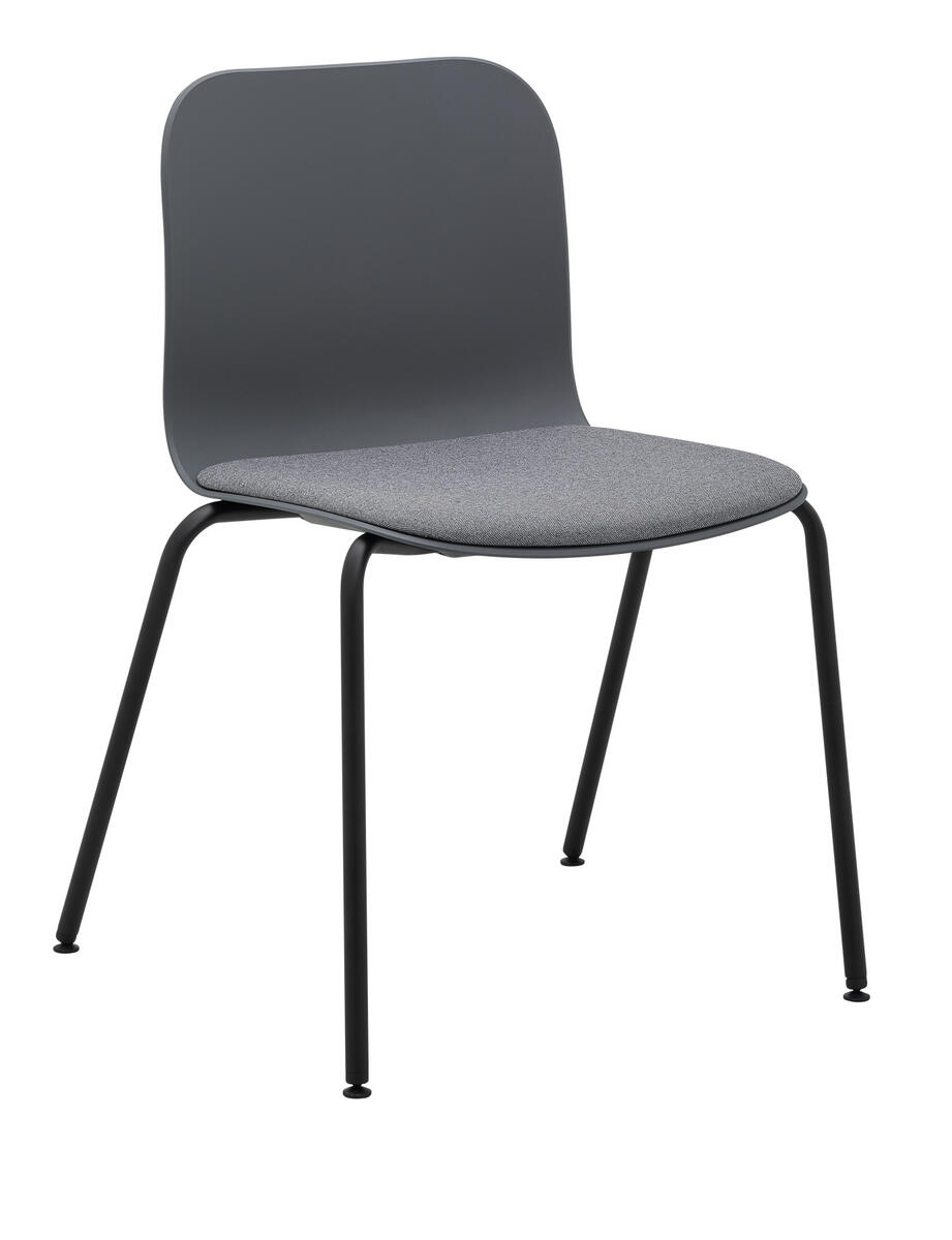 Stapelbarer Mehrzweckstuhl, Sitz und Rückenlehne Kunststoff, Sitzpolster, auf einem Gestell aus Metal.