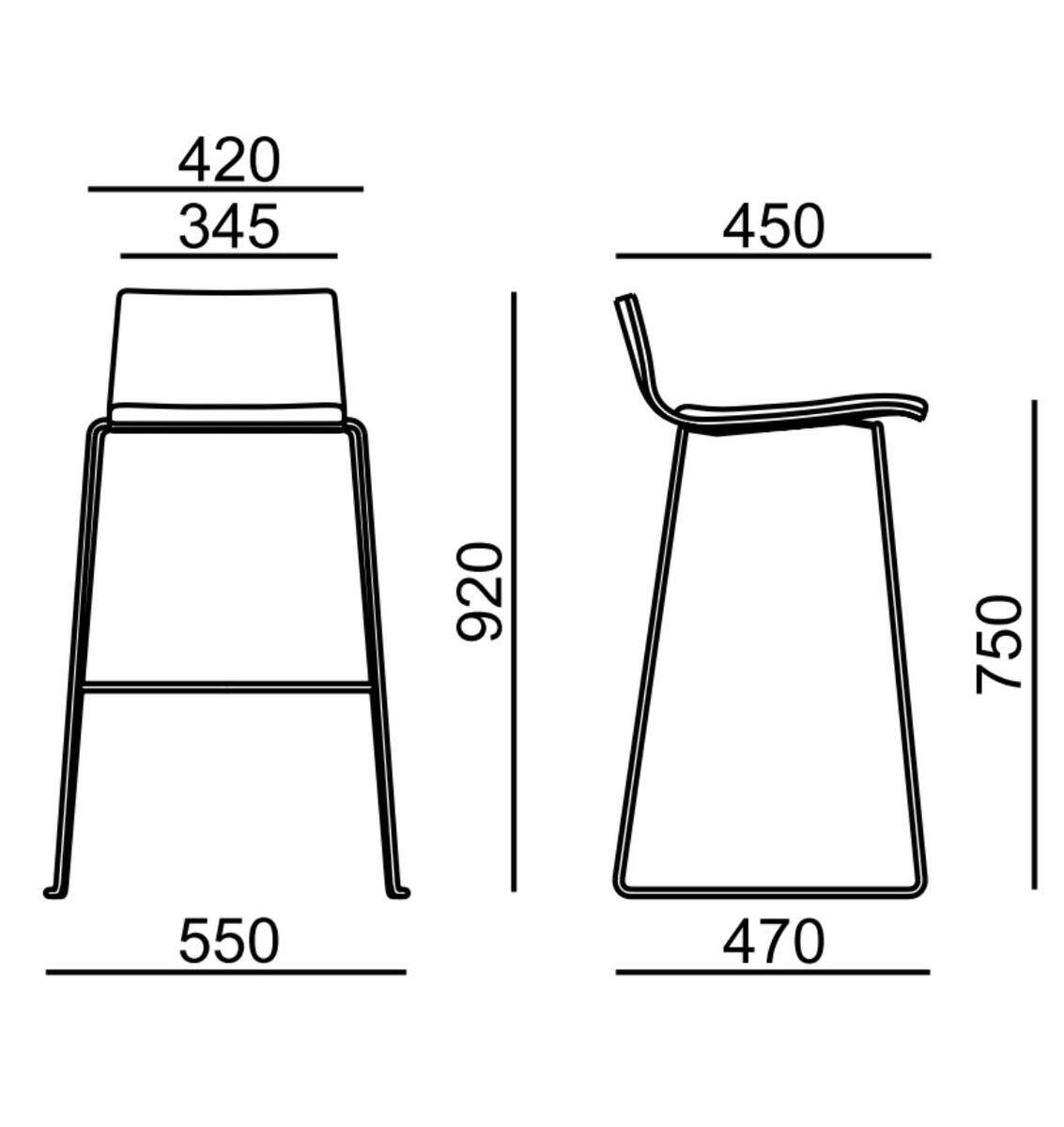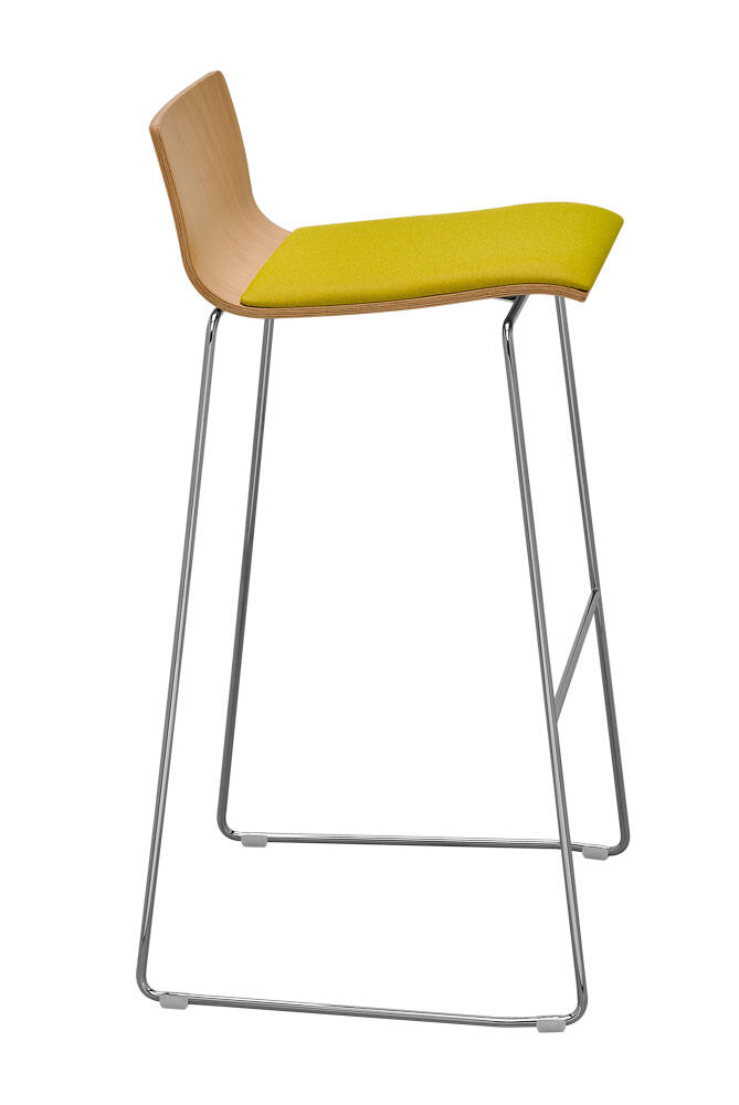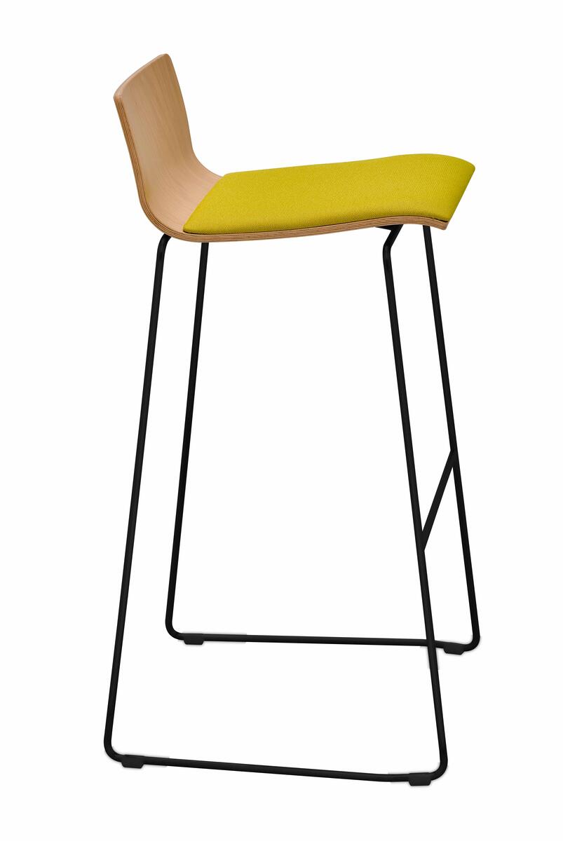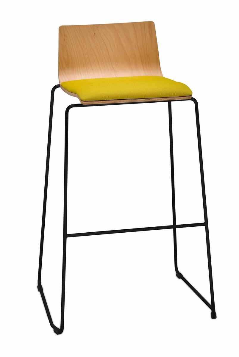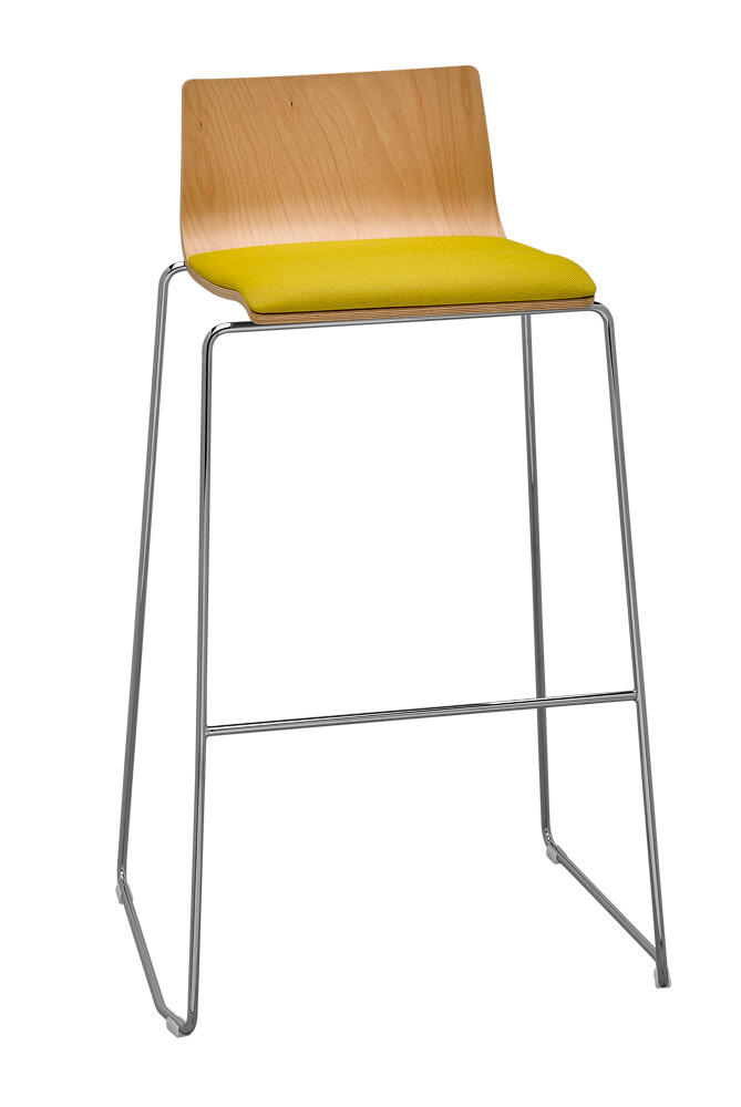 Stapelbarer Barhocker aus Holz mit niedrig Rückenlehne und gepolsterten Sitz. Die Buchenschale ist auf einem Kufengestell mit Fußstütze.