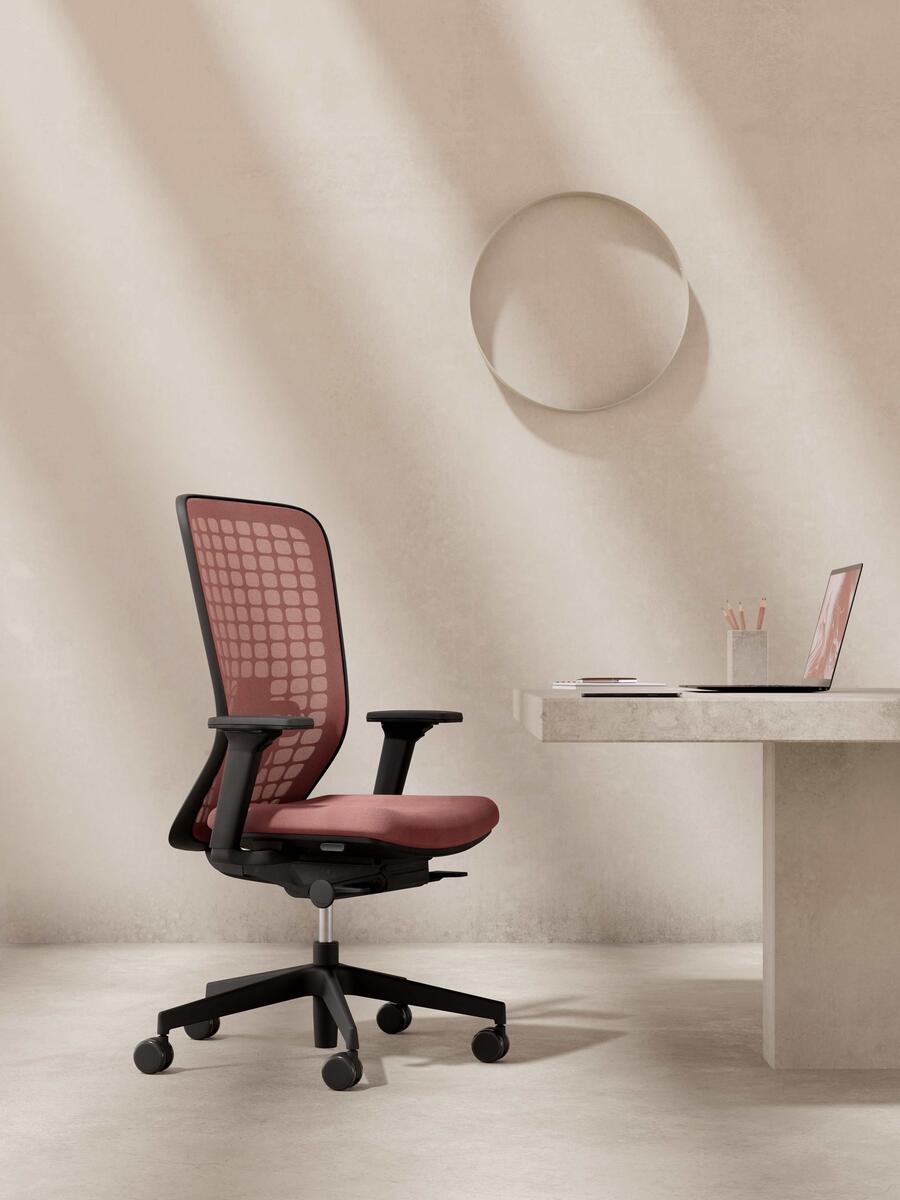 Der 3D-gestrickte Stoff zusammen mit der integrierten Lordosenstütze sorgt für höchsten Komfort. Dank des abfallfreien Prozesses wird der Stoff passgenau in Größe und Form gestrickt, sodass er sich perfekt an die Rückenlehne anfügt. Erhältlich in Rot, Beige und Grün.