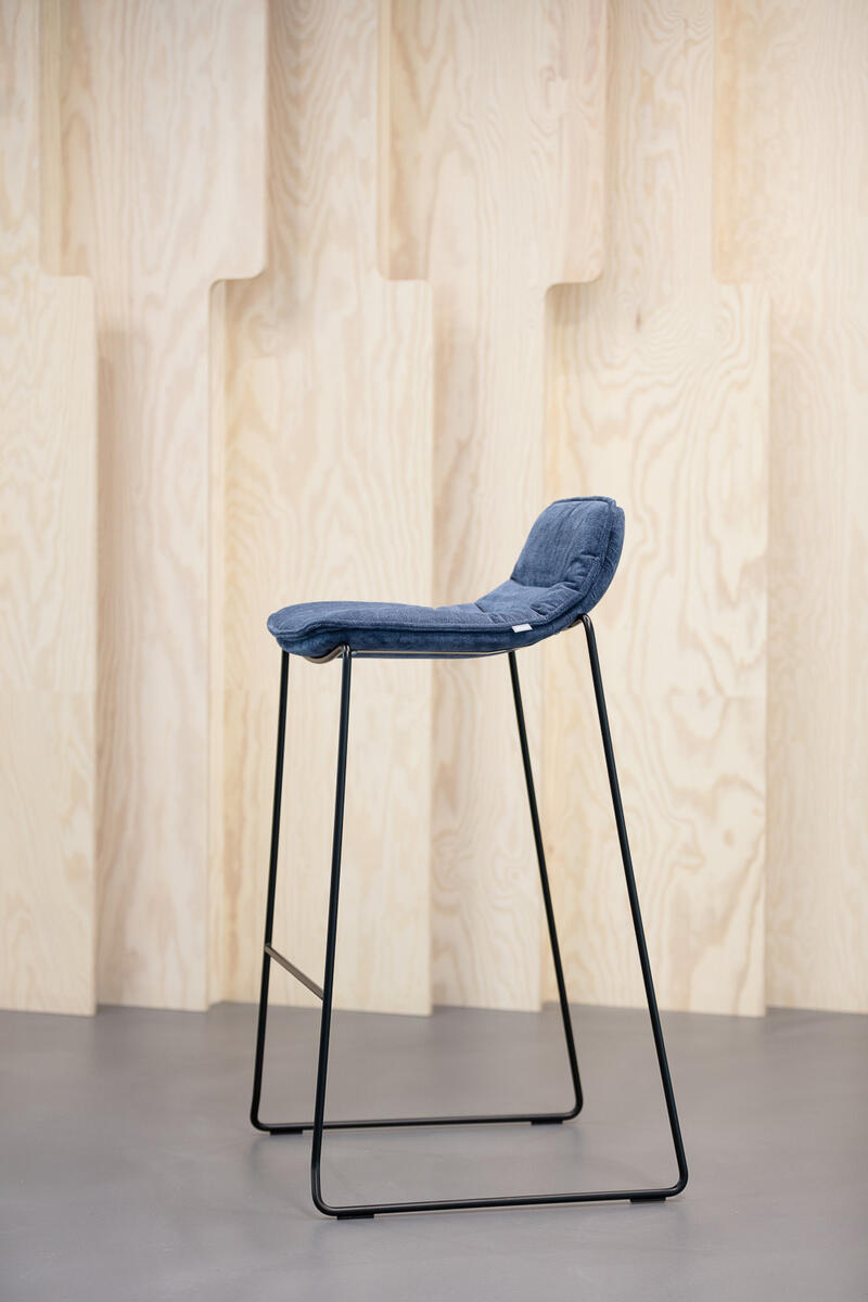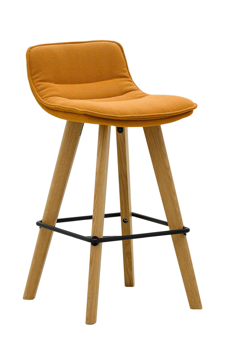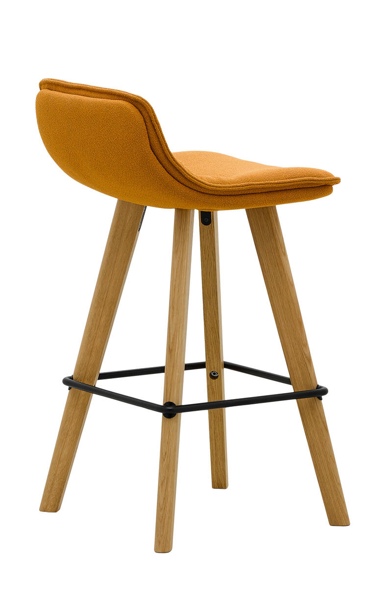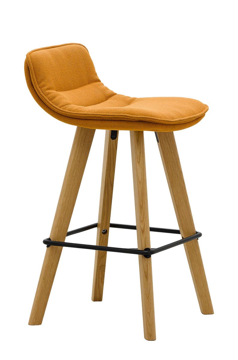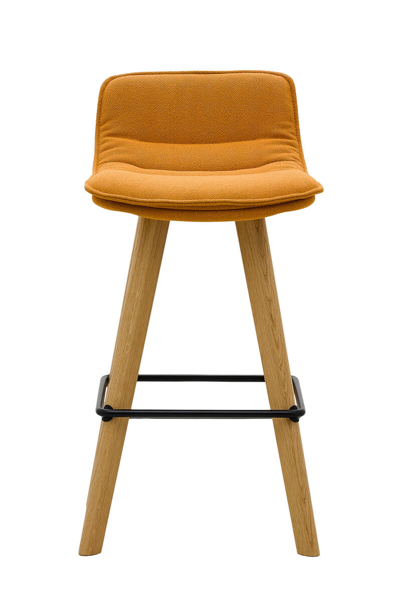 Vollständig gepolsterter Barhocker in Küchenhöhe mit Holzgestell. Die niedrige Rückenlehne bietet ausreichenden Halt und Komfort, auch bei längerem Sitzen. Die doppellagige Schale ermöglicht eine zweifarbige Polsterung.