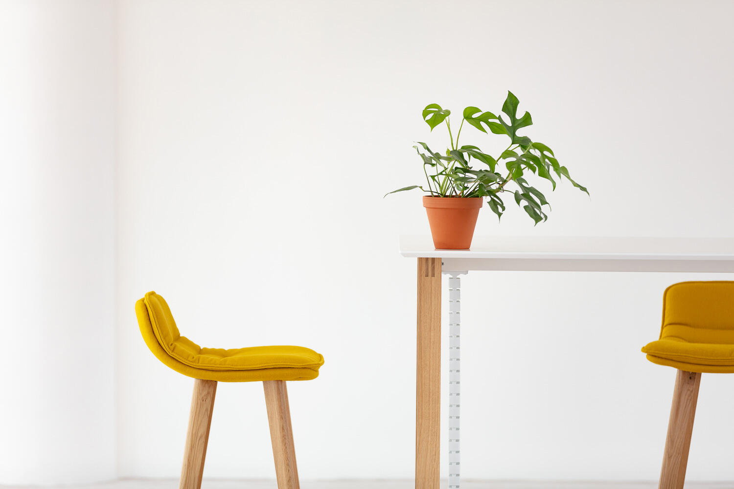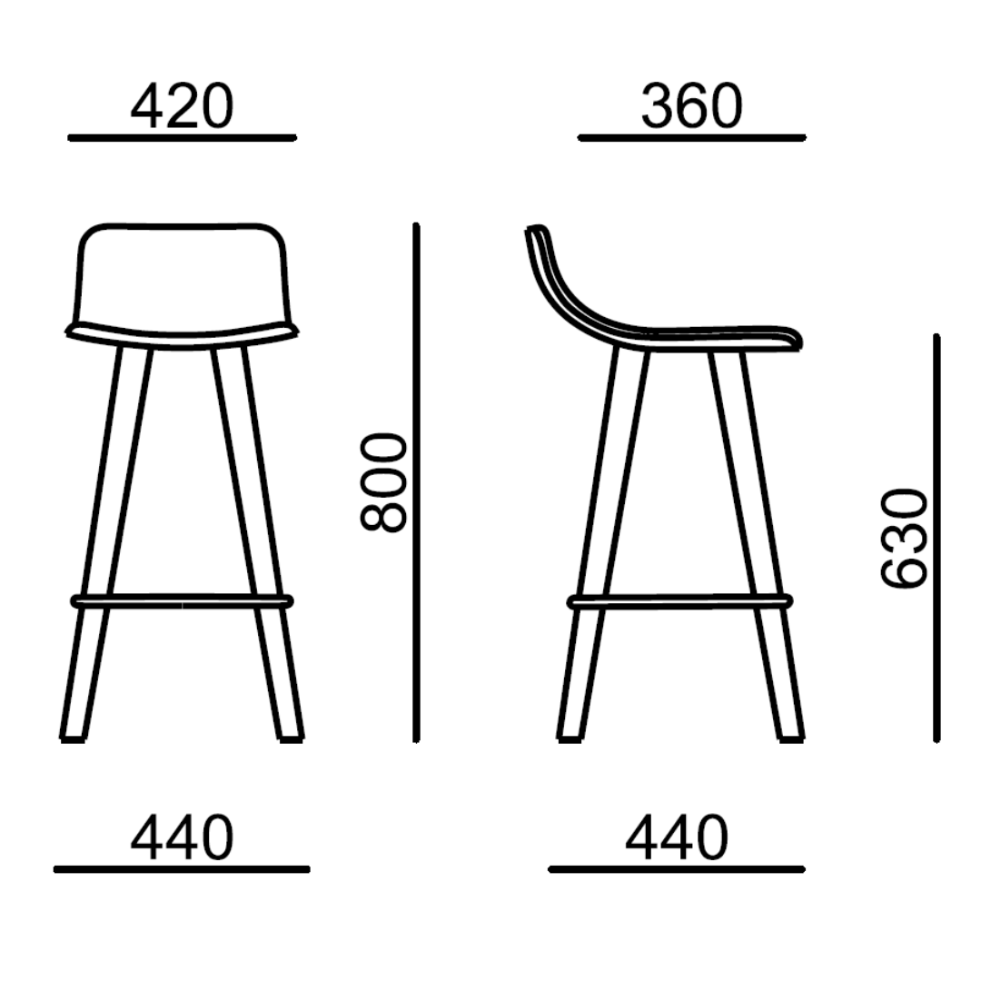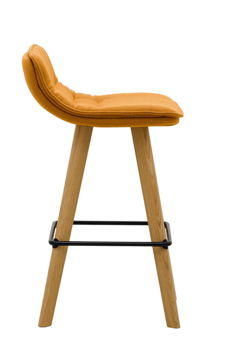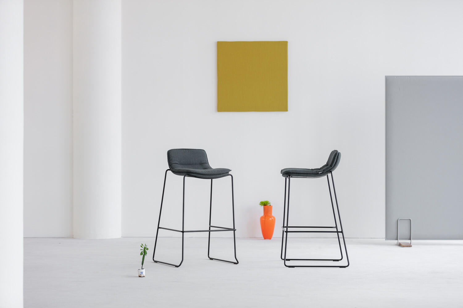 Vollständig gepolsterter Barhocker in Küchenhöhe mit Holzgestell. Die niedrige Rückenlehne bietet ausreichenden Halt und Komfort, auch bei längerem Sitzen. Die doppellagige Schale ermöglicht eine zweifarbige Polsterung.