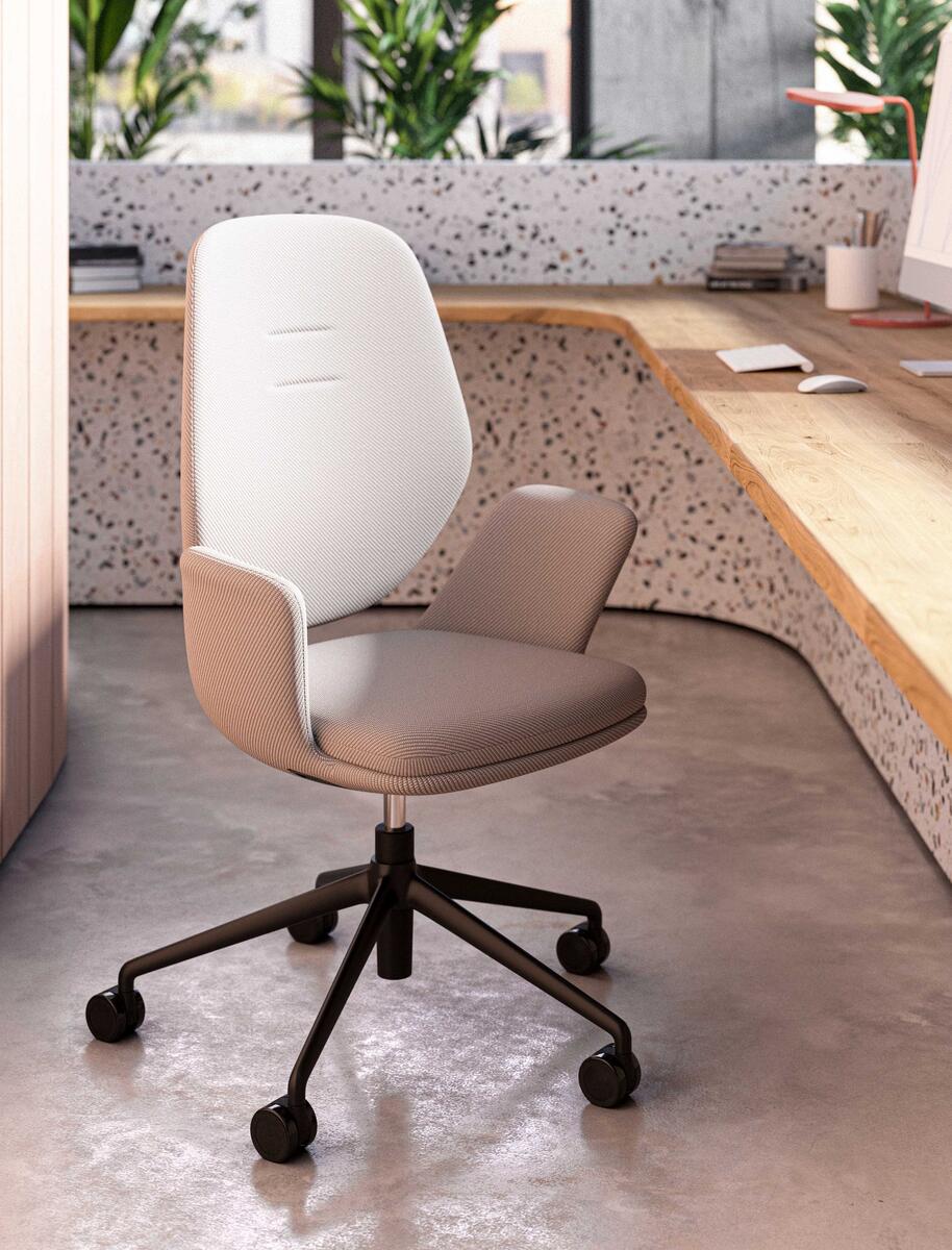 Der Arbeitsstuhl Muuna verfügt über eine versteckte, sorgfältig gepolsterte SELF-Mechanik, die sämtliche Einstellungen selbstständig übernimmt. Er fügt sich mühelos in jedes Interieur ein. Die Polsterung bietet eine große Auswahl an Materialien und Farben, was seine Anpassungsfähigkeit zusätzlich erhöht.