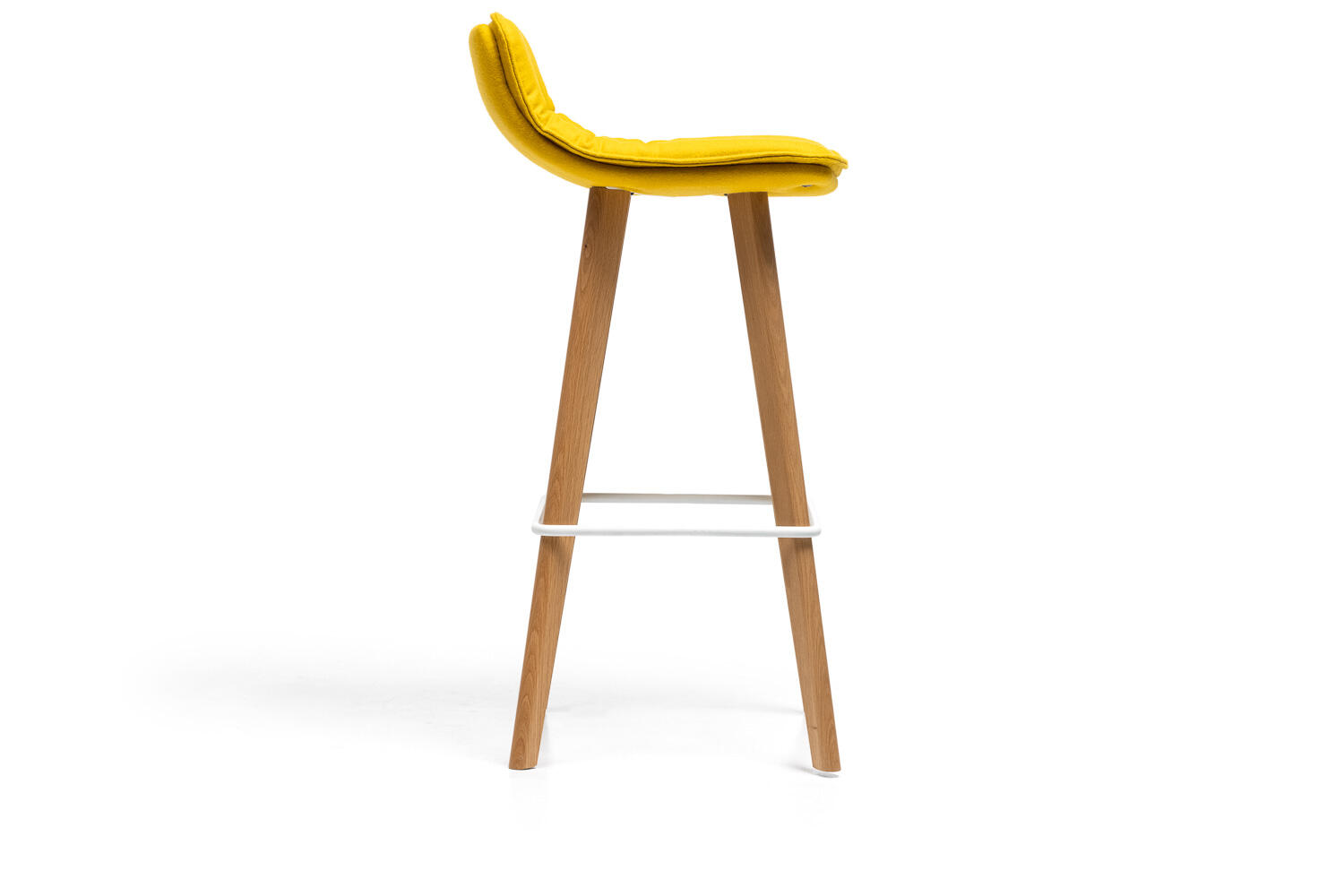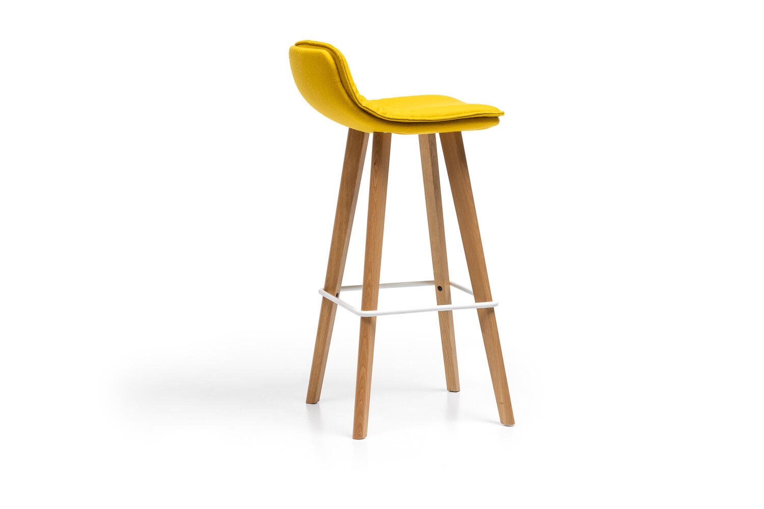Fully upholstered bar stool on a wooden base. The low backrest provides sufficient support and comfort, even during an extended period of sitting. The dual-layer shell allows for two-tone upholstery.
