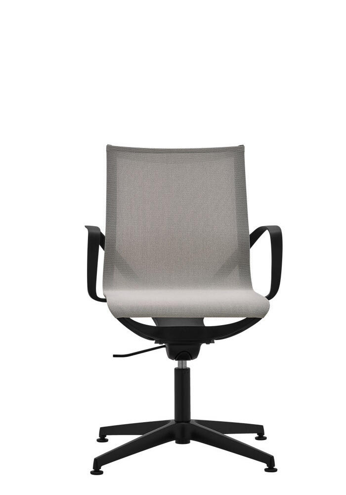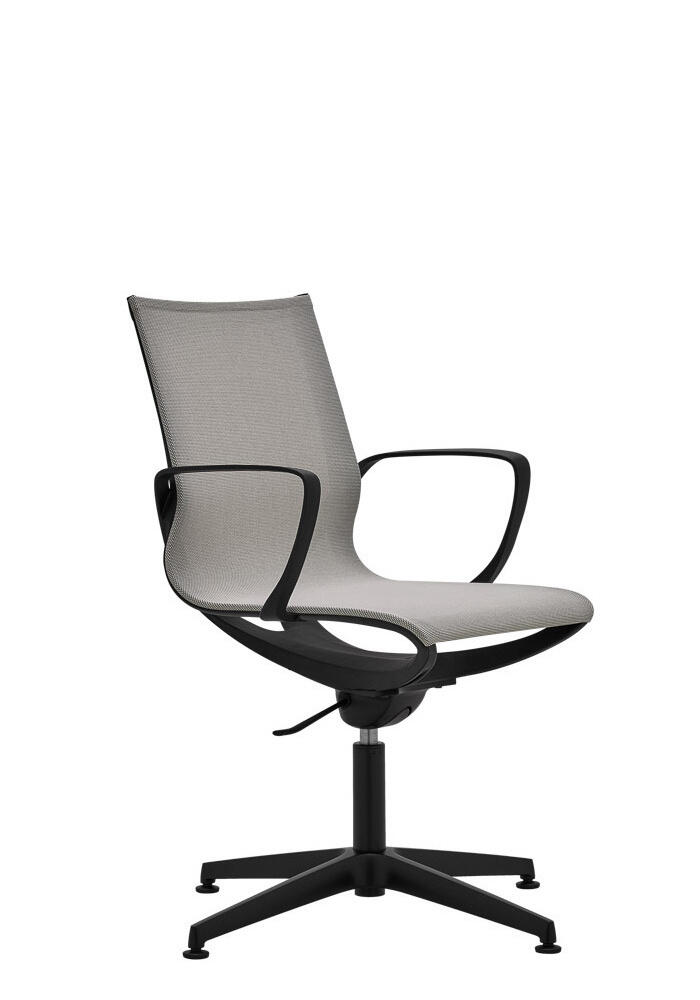 Swivel office chair with lightweight plastic structure and integrated fixed armrests. Both seat and backrest are upholstered with breathable mesh. Available in black or white plastic.