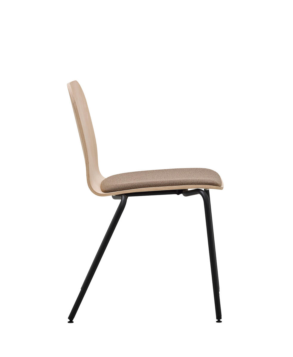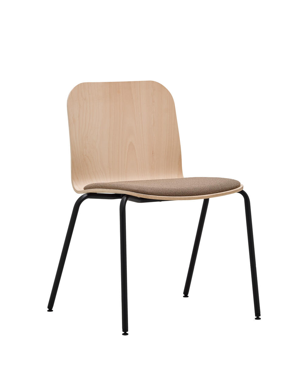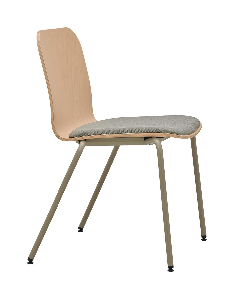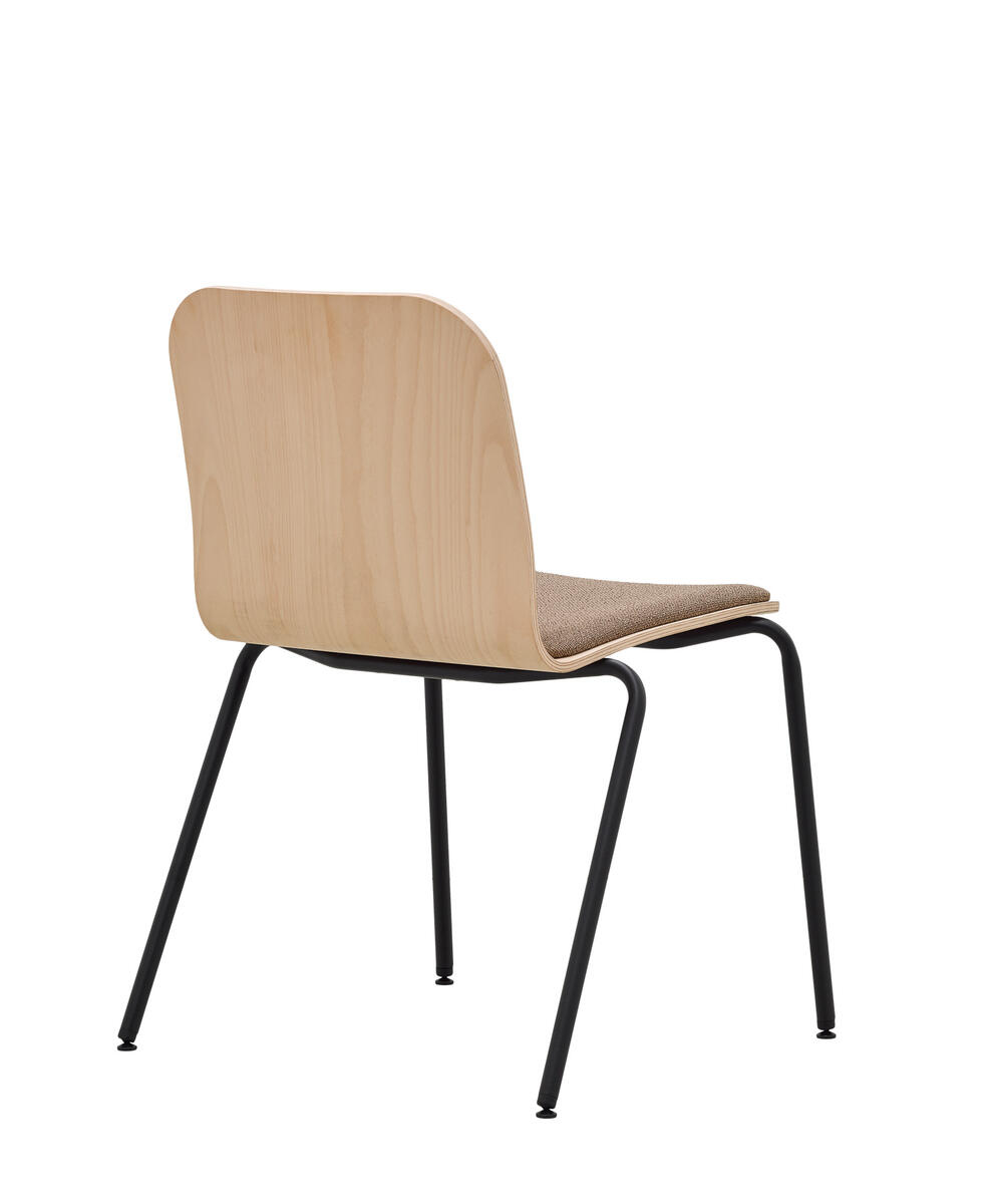 Chaise polyvalente empilable, coque en bois de hêtre avec le segment de l'assise rembourré, piètement métallique à quatre pieds. Le capot en plastique sous l’assise garantit un empilage sûr des chaises sans endommager le rembourrage.
