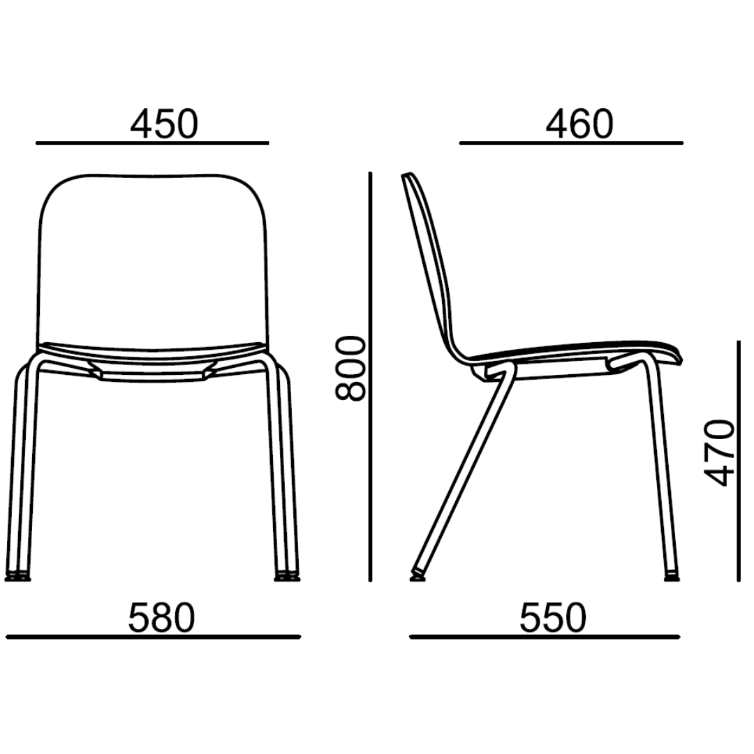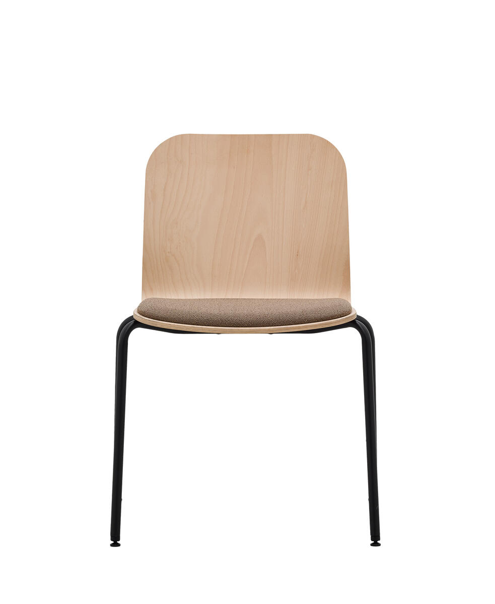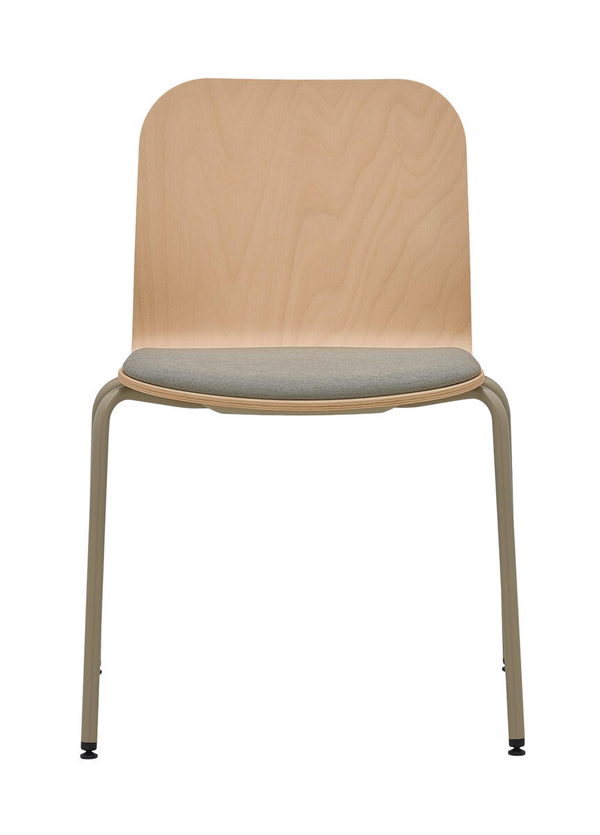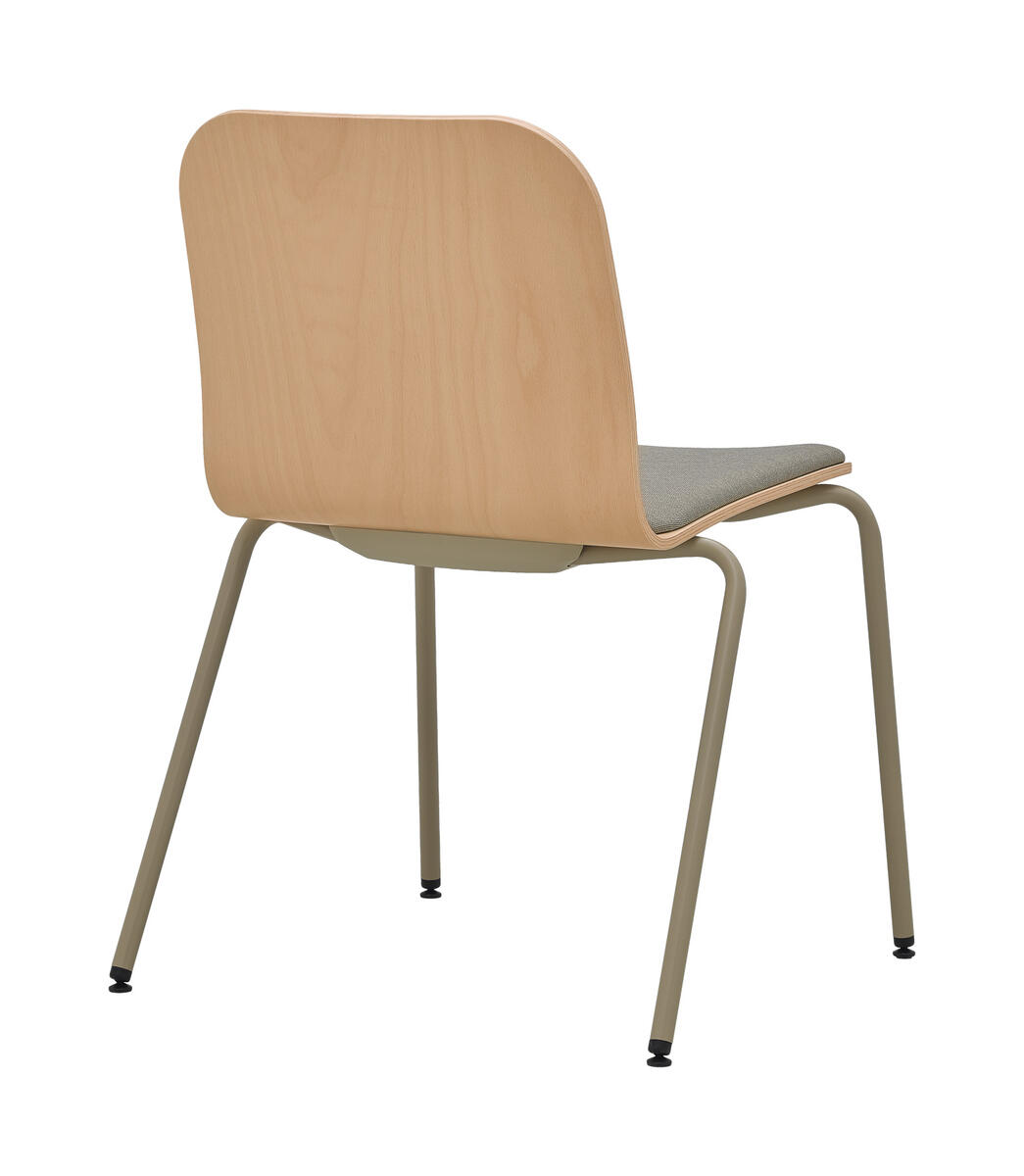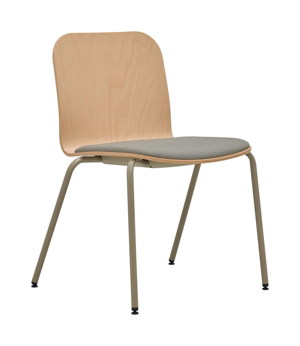 Chaise polyvalente empilable, coque en bois de hêtre avec le segment de l'assise rembourré, piètement métallique à quatre pieds. Le capot en plastique sous l’assise garantit un empilage sûr des chaises sans endommager le rembourrage.