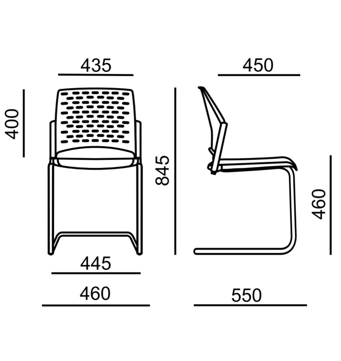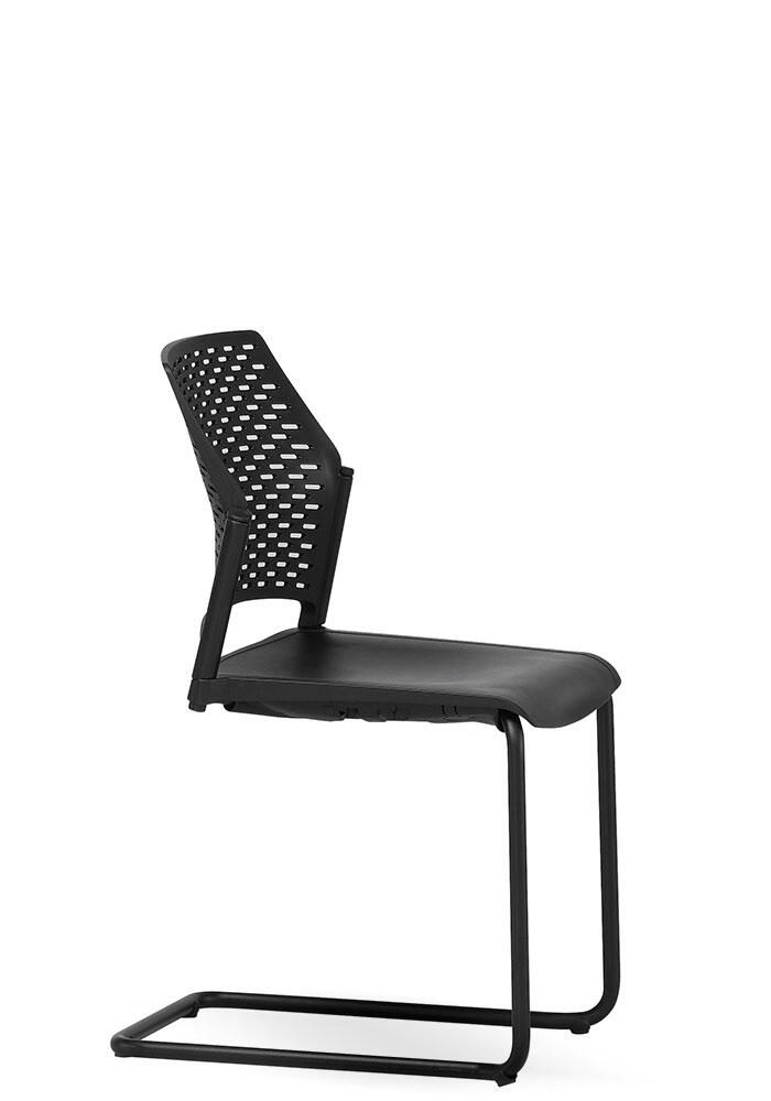 Stohovatelná konferenční židle s plastovým sedákem a ergonomicky tvarovanou děrovanou plastovou opěrou na pérovém rámu.
