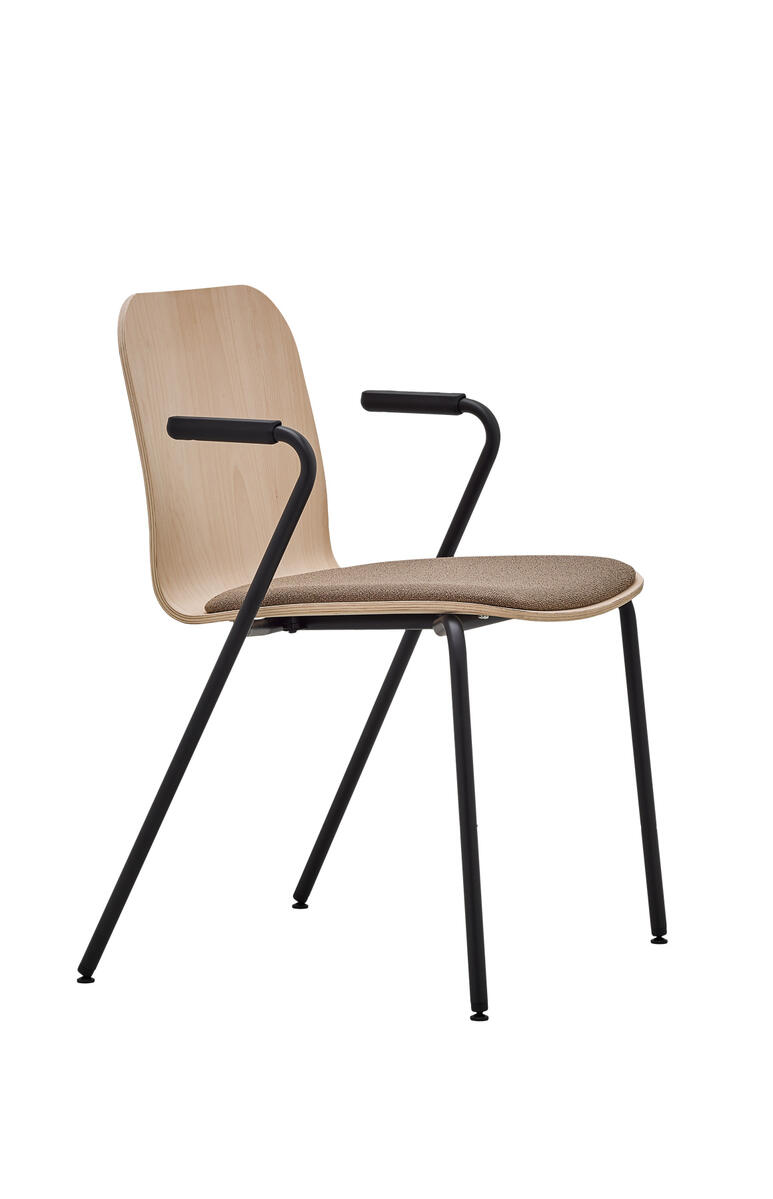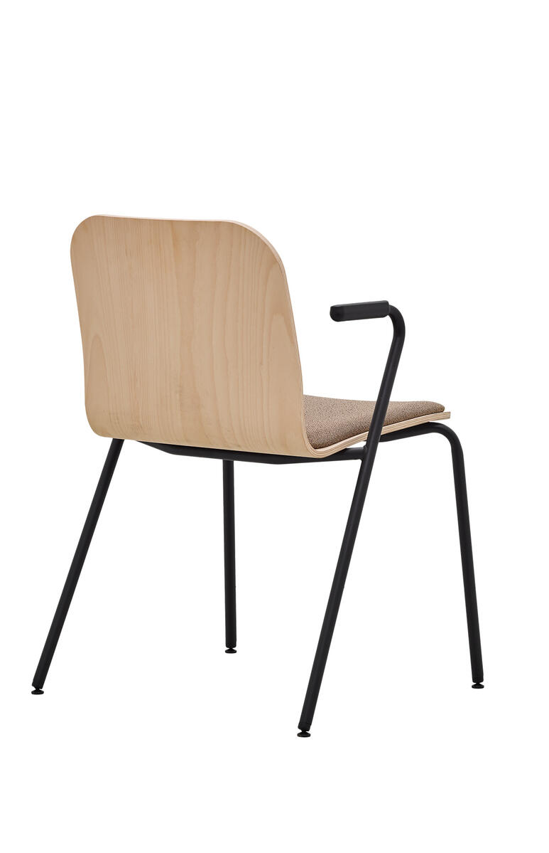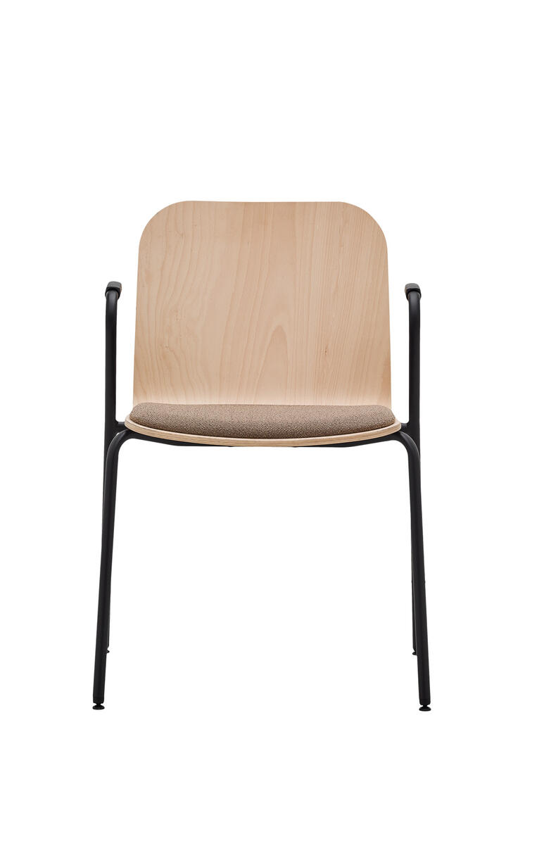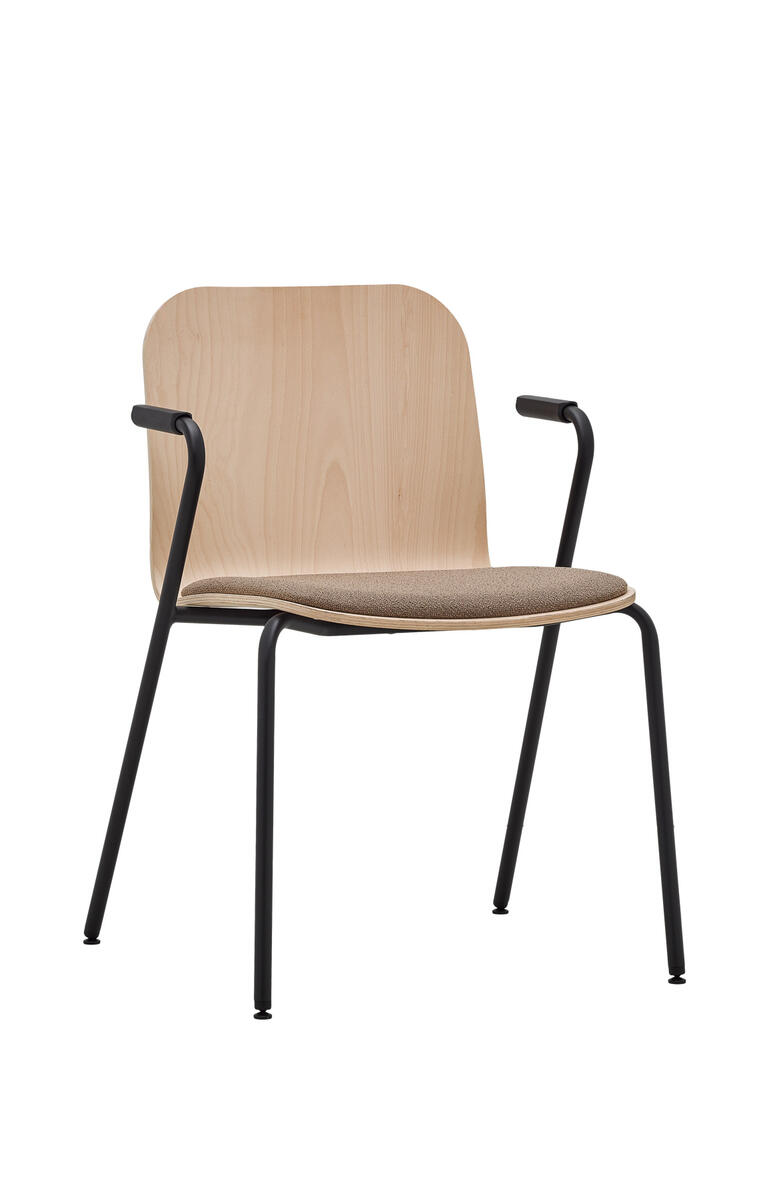 Stapelbarer Mehrzweckstuhl mit Armlehnen, Schale aus Buchenholz mit gepolstertem Sitzsegment, auf einem vierbeinigen Metallgestell. Die Kunststoffabdeckung an der Unterseite des Sitzes gewährleistet ein sicheres Stapeln der Stühle, ohne die Polsterung zu beschädigen.