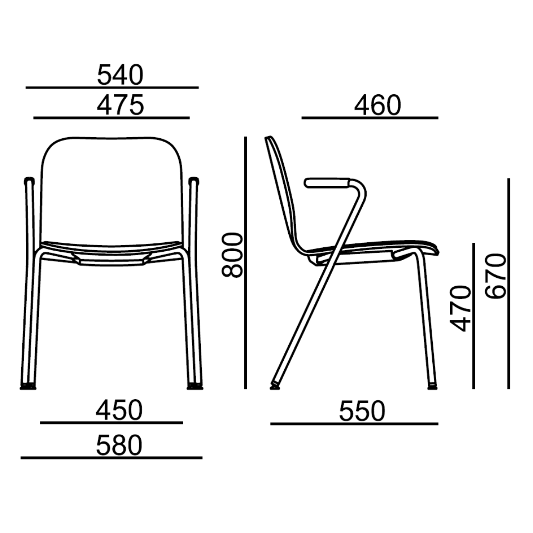 Vierbeinrahmen aus Stahlrohren mit einem Durchmesser von 20 x 2 mm mit Gelenkgleitern. Die Oberflächenbeschichtung des Rahmens ist Pulverbeschichtetes Schwarz Der Kunststoffteil der Armlehnen - Polypropylen (PP).