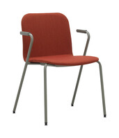 Stapelbarer Mehrzweckstuhl mit Armlehnen, vollgepolsterte Schale aus Buchenholz, auf einem vierbeinigen Metallgestell. Die Kunststoffabdeckung an der Unterseite des Sitzes gewährleistet ein sicheres Stapeln der Stühle, ohne die Polsterung zu beschädigen.
