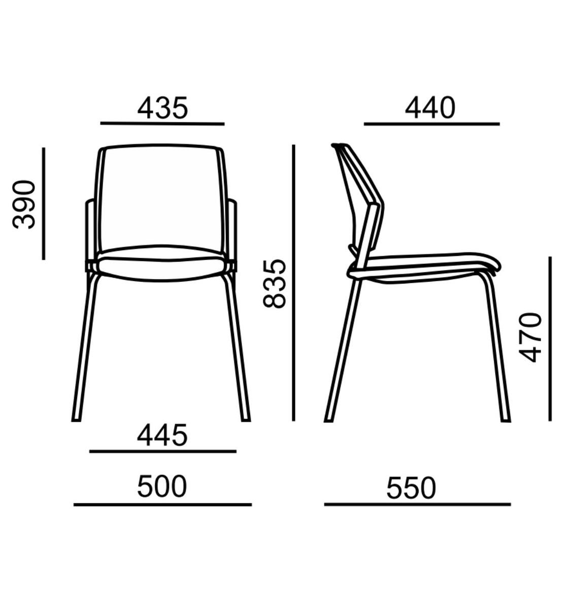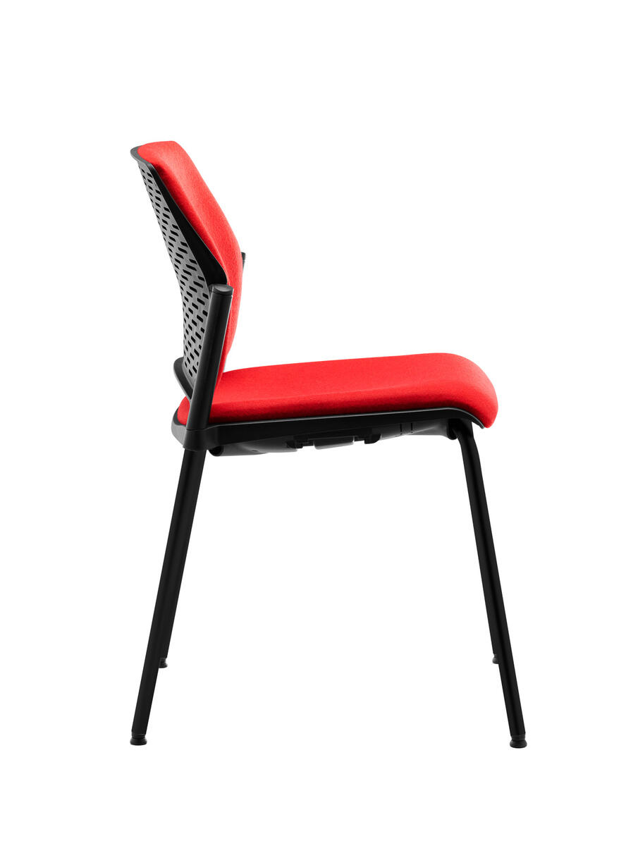 Einfacher stapelbarer Vierfuß-Konferenzstuhl mit gepolstertem Sitz und Rückenlehne.