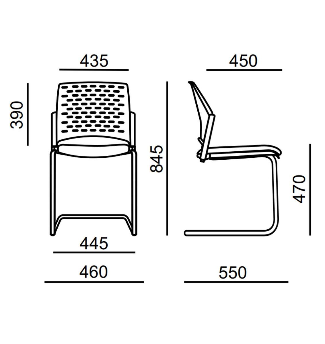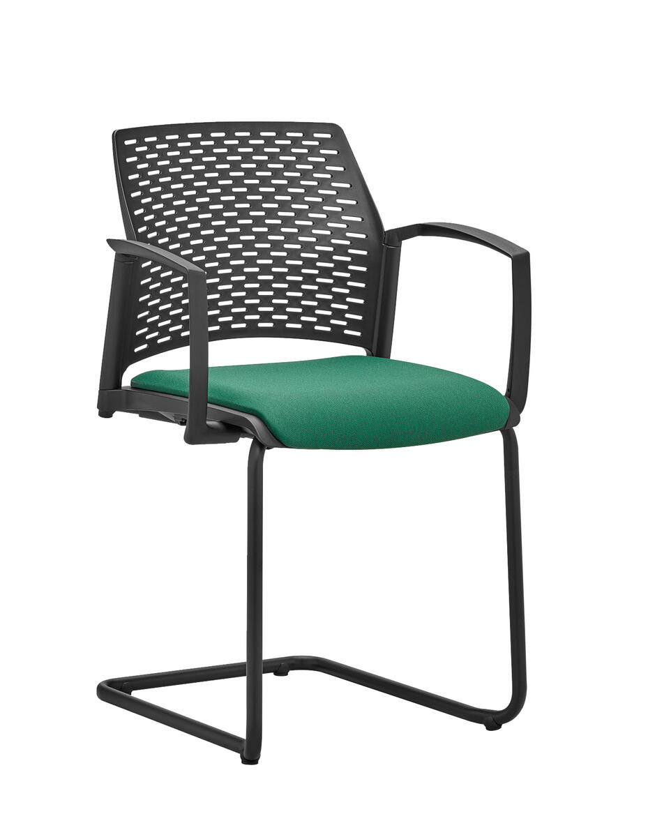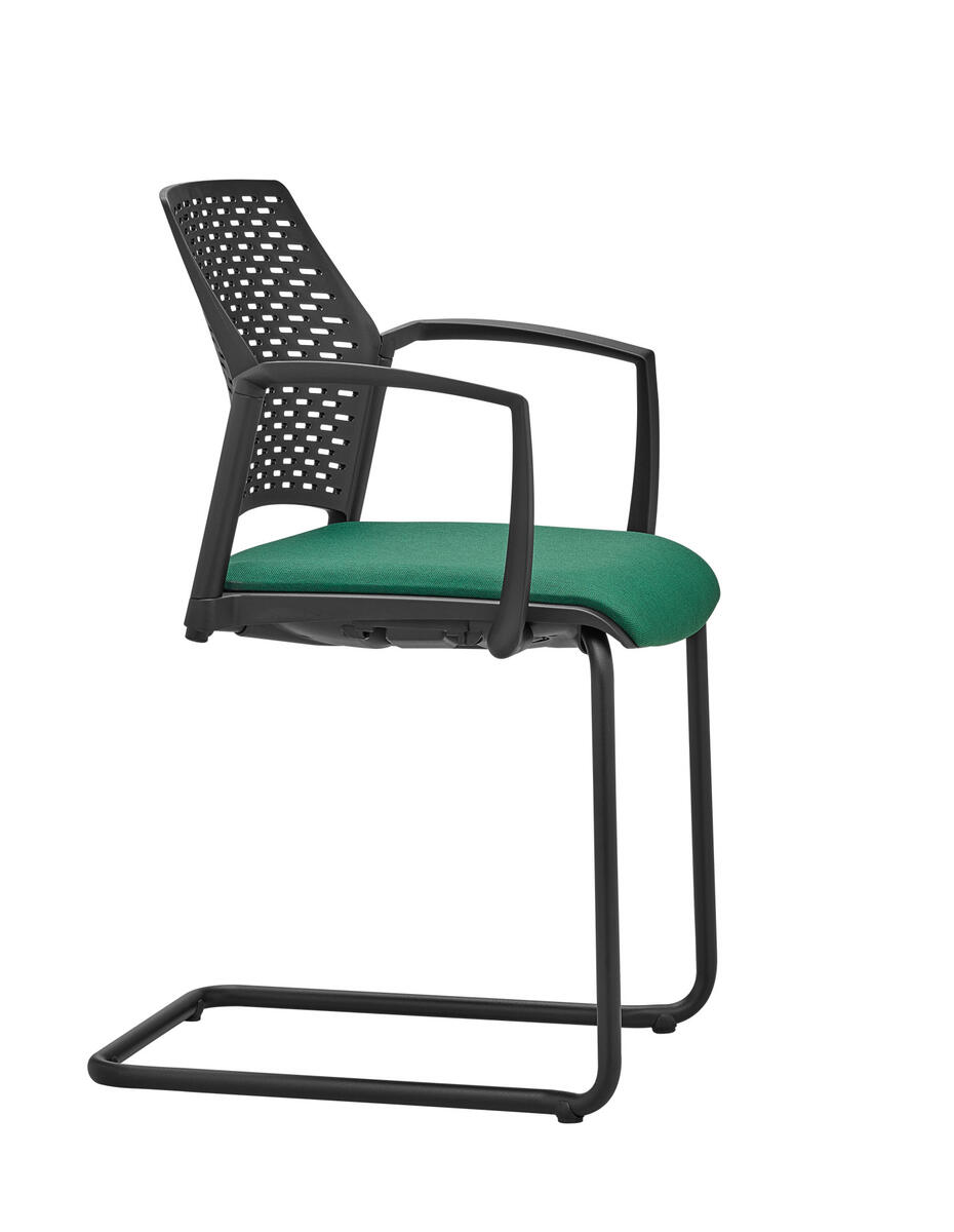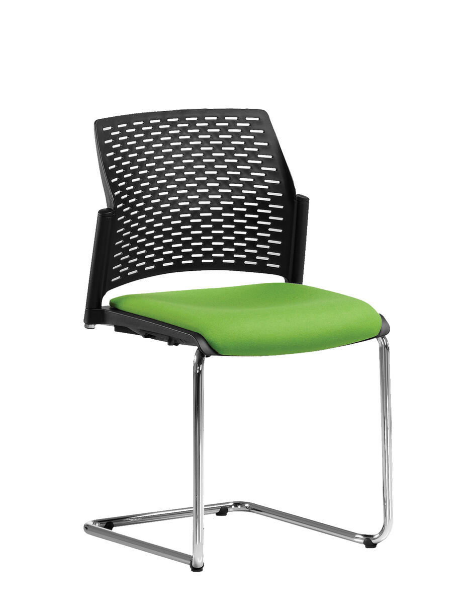 Einfacher stapelbarer Freischwinger-Konferenzstuhl mit gepolstertem Sitz und Kunststoff-Rückenlehne.