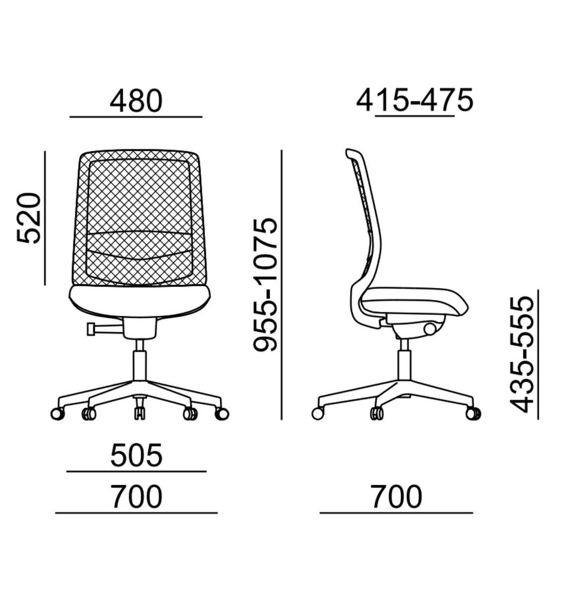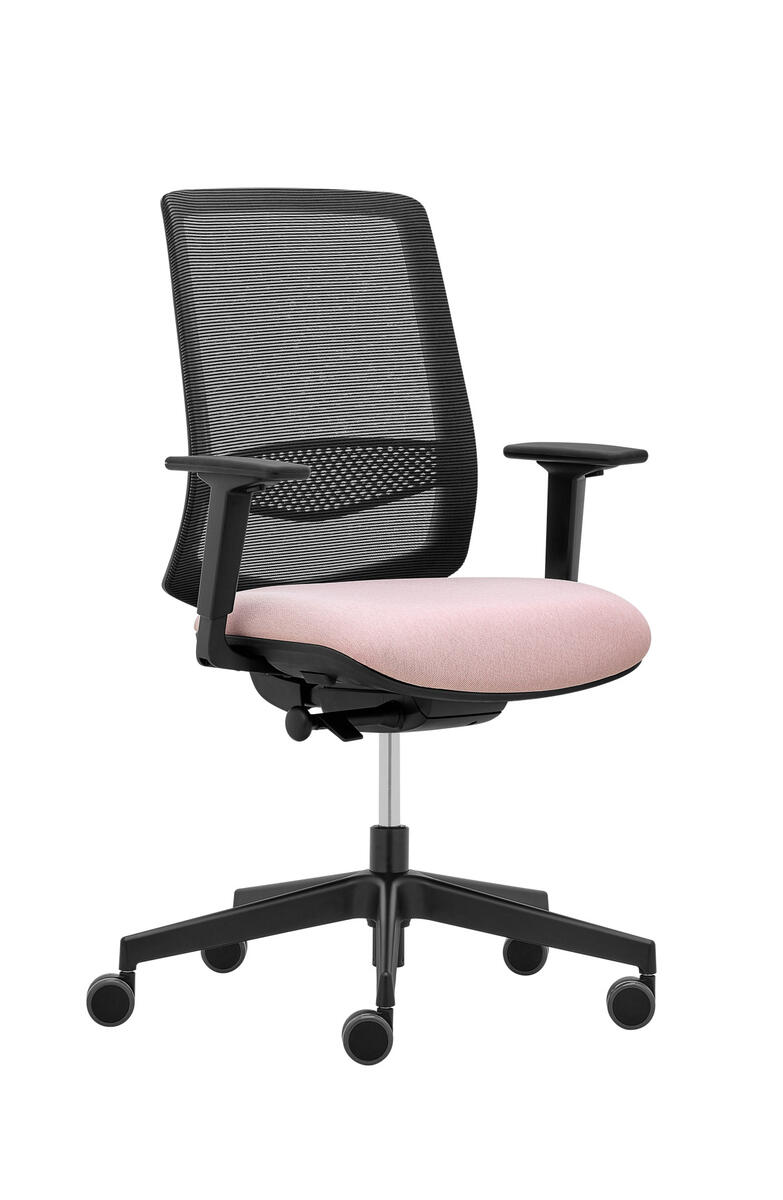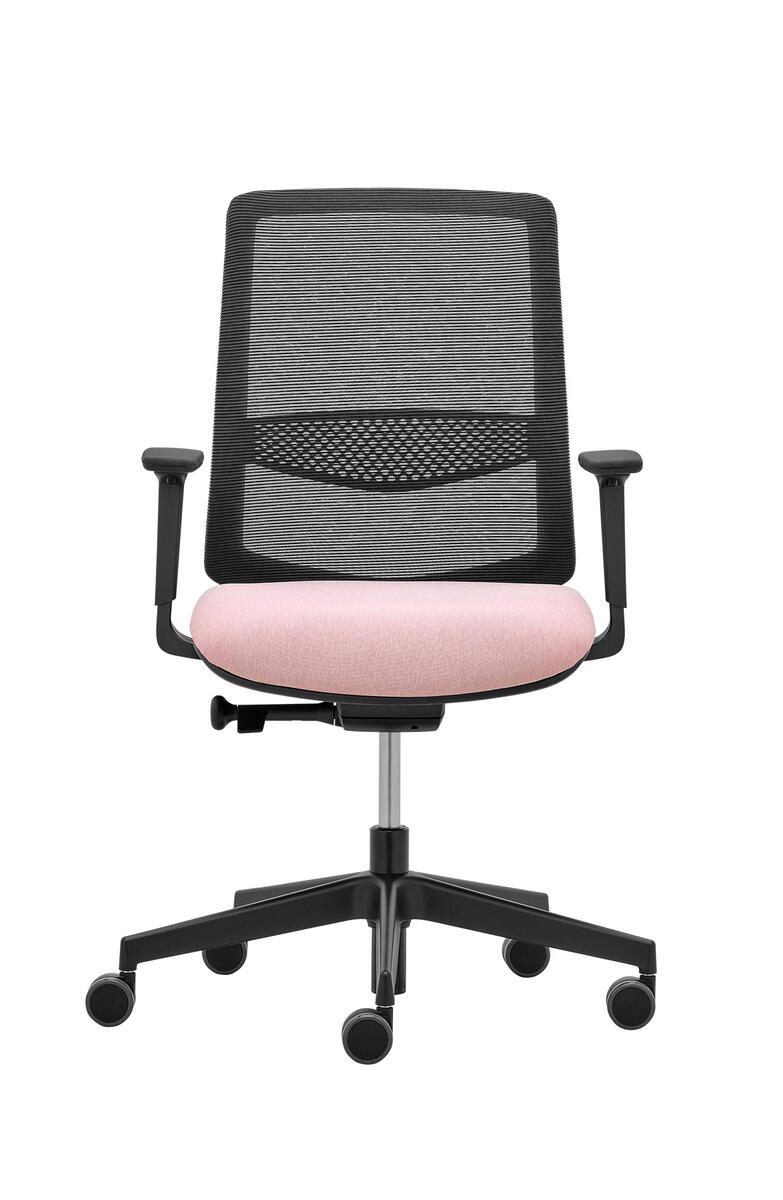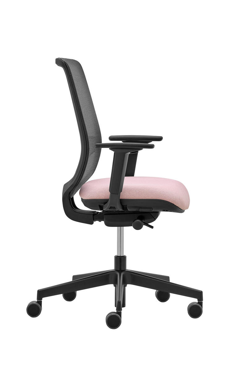 Moderner Bürodrehstuhl mit mittelhoher Rückenlehne, Netz bezogen. Nahtloser Sitz mit Schiebesitz 6 cm. SELF 1 Synchronmechanik.
