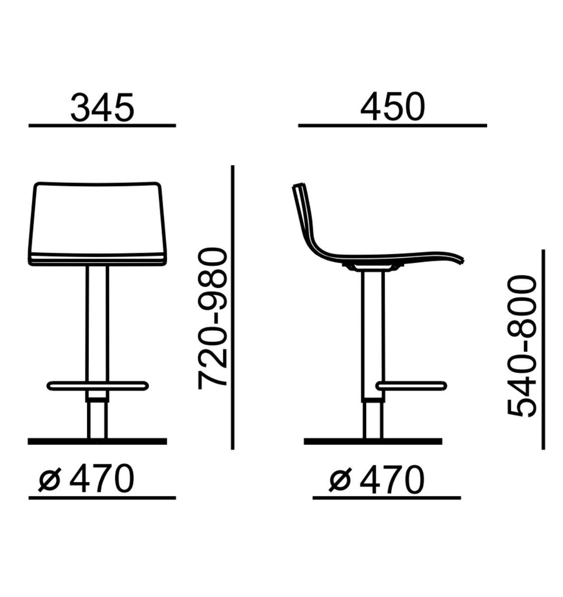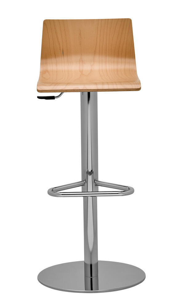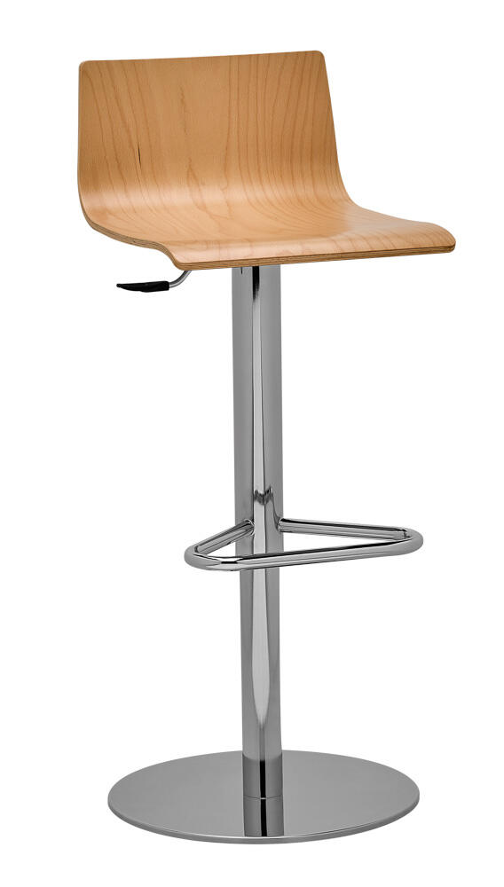 Höhenverstellbarer Barhocker aus Holz mit niedriger Rückenlehne. Buchenschale auf verchromtem Zentralfuß mit Scheibenfuß.