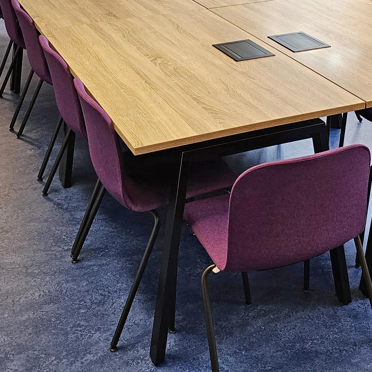 Der Besprechungsraum wurde maßgeschneidert, um seinen multifunktionalen Charakter zu unterstützen und neue Energie in jeden Winkel zu bringen. Die praktischen Möbel werden durch unseren Lambda-Stuhl ergänzt, der in einem dynamischen lila Farbton gepolstert ist und die Identität des KOK-Zentrums verkörpert.