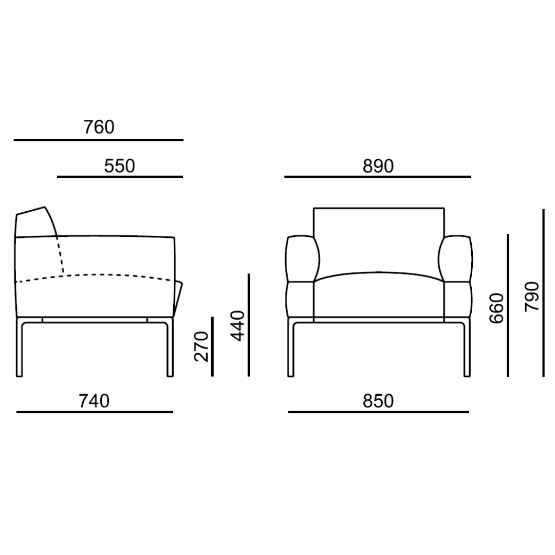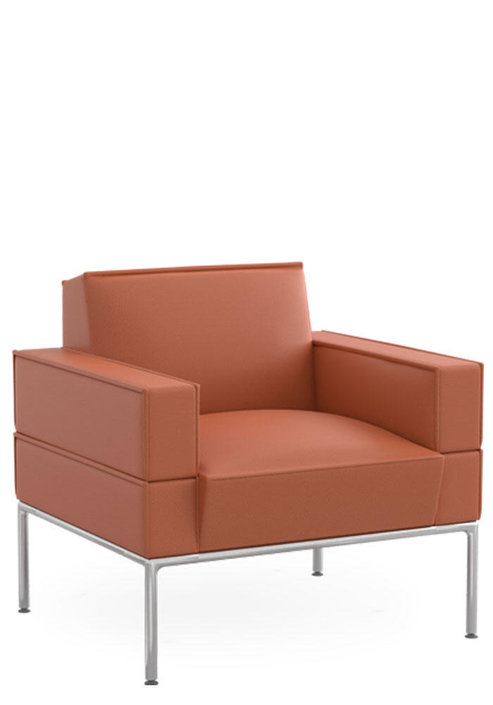 Single-seater sofa with cubic and organic shapes from Kai Stania collection. The sofa is distinguished by high comfortable sitting thanks to zig-zag springs and softened backrest edges. Elegant sewing details, chrome tubular frame and possibility of various upholstery combination rank this sofa among executive categhory.
