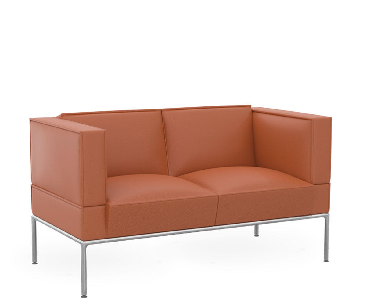 Two- seater sofa with cubic and organic shapes from Kai Stania collection. The sofa is distinguished by high comfortable sitting thanks to zig-zag springs and softened backrest edges. Elegant sewing details, chrome tubular frame and possibility of various upholstery combination rank this sofa among executive category.