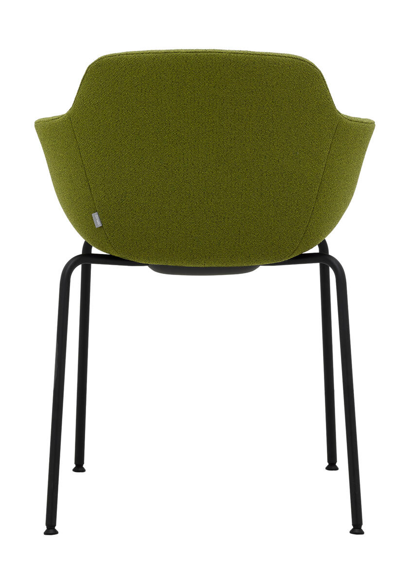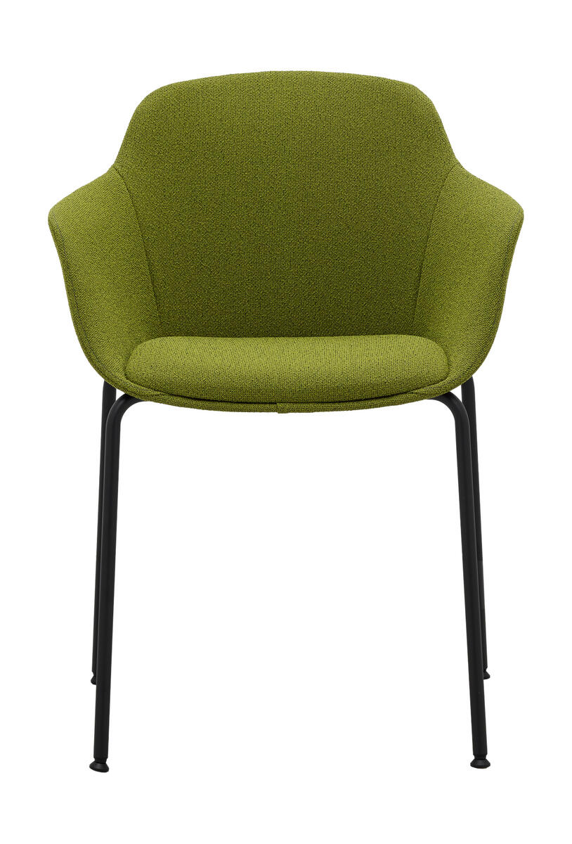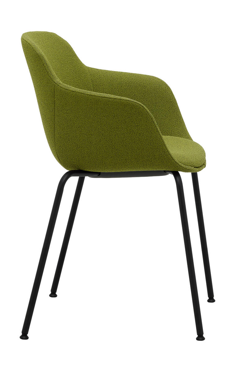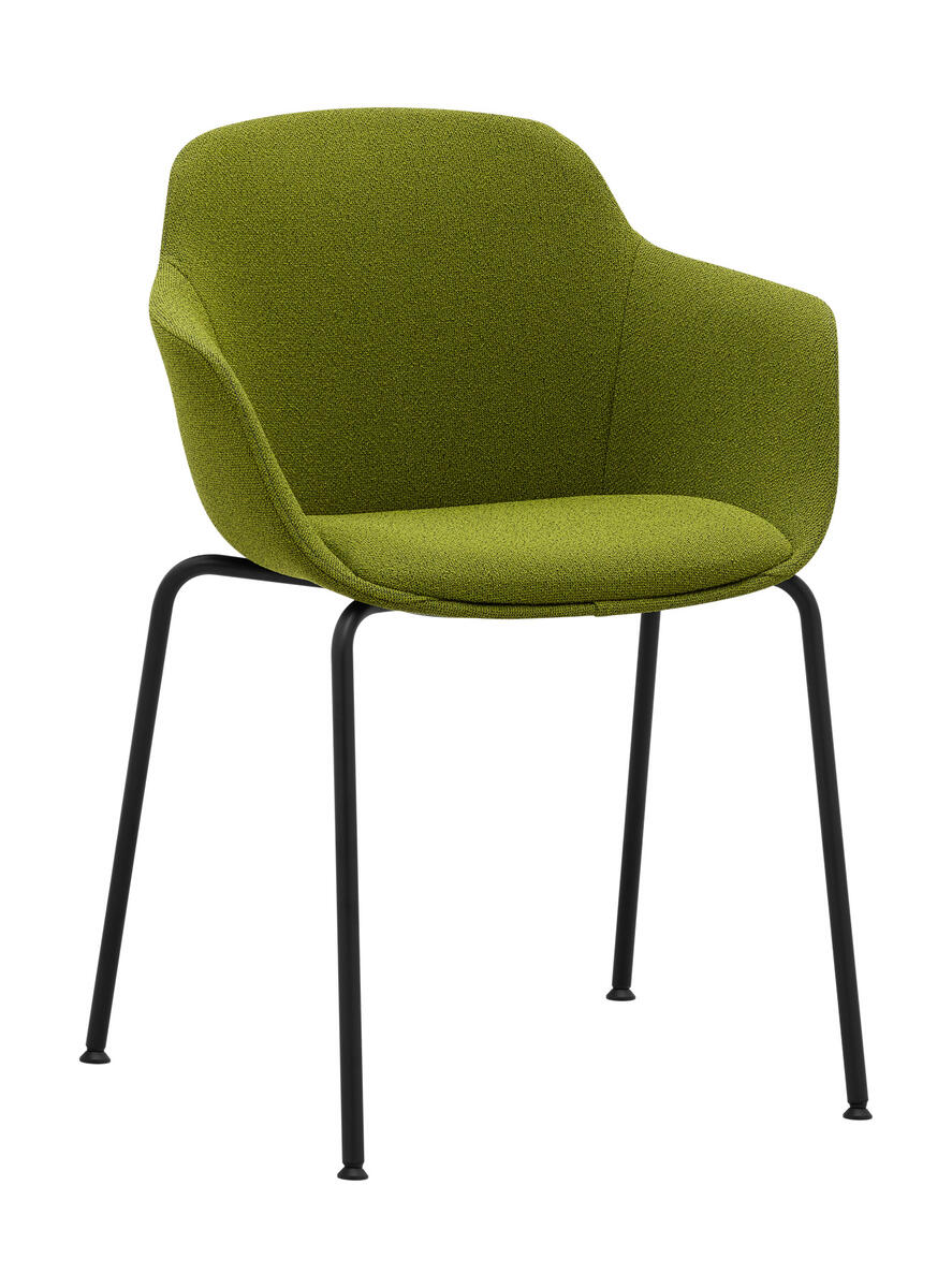 Multipurpose chair, fully upholstered plastic shell with armrests, upholstered seat segment for extra comfort, black four-legged metal base.