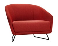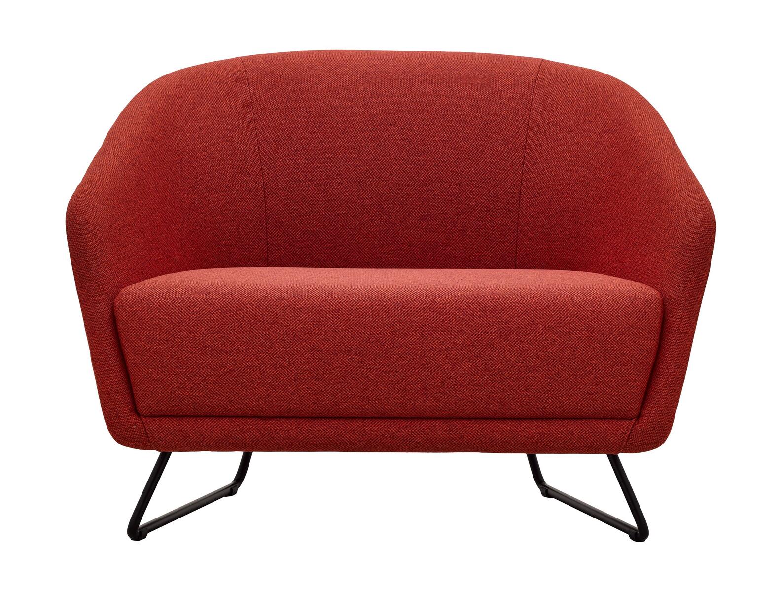 Fully upholstered mini-sofa with curved shapes, offering the option to upholster the seat and backrest in three different colors. The sofa is standardly mounted on a black metal frame with plastic glides.