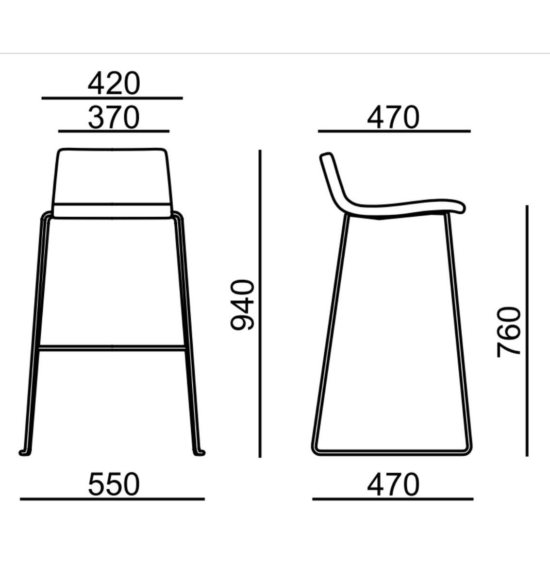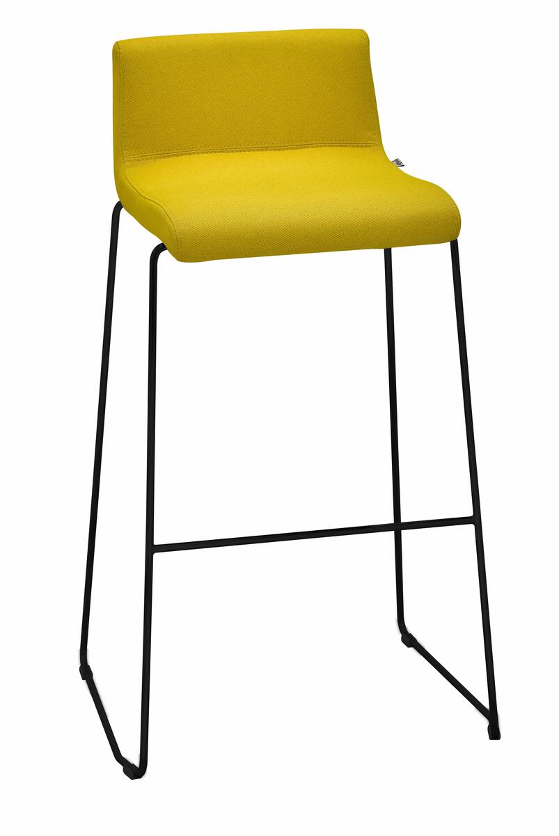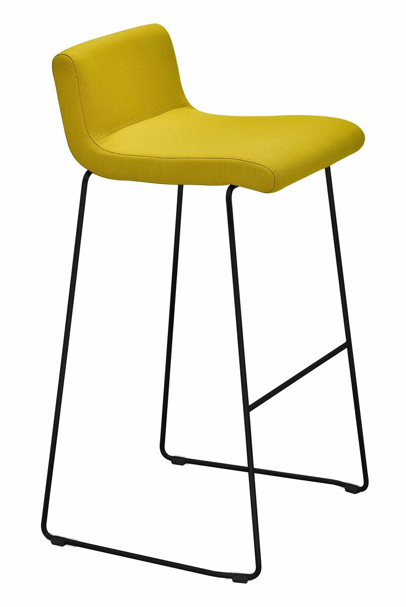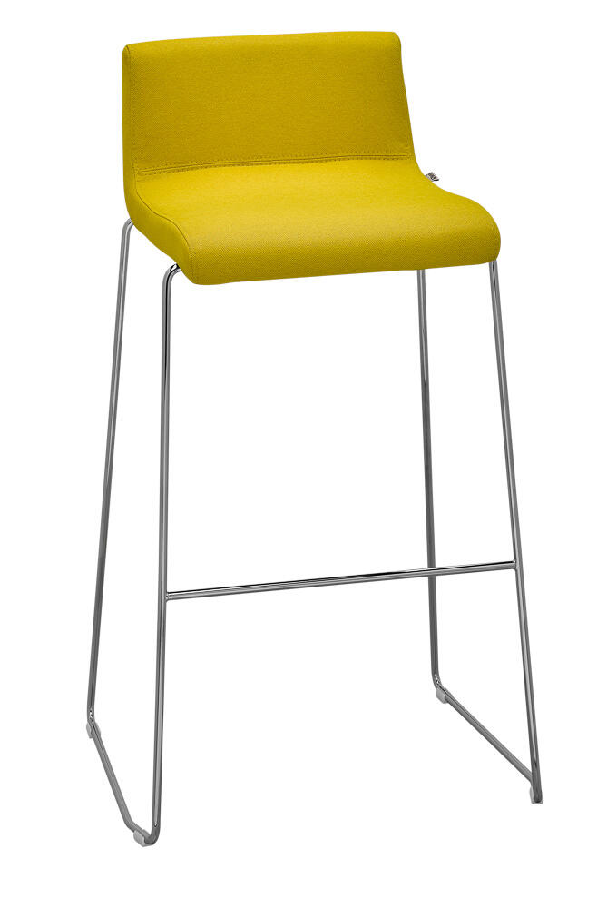 Fully-upholstered stackable bar stool with low backrest. Upholstered beech shell on firm wire chrome frame with footrest.