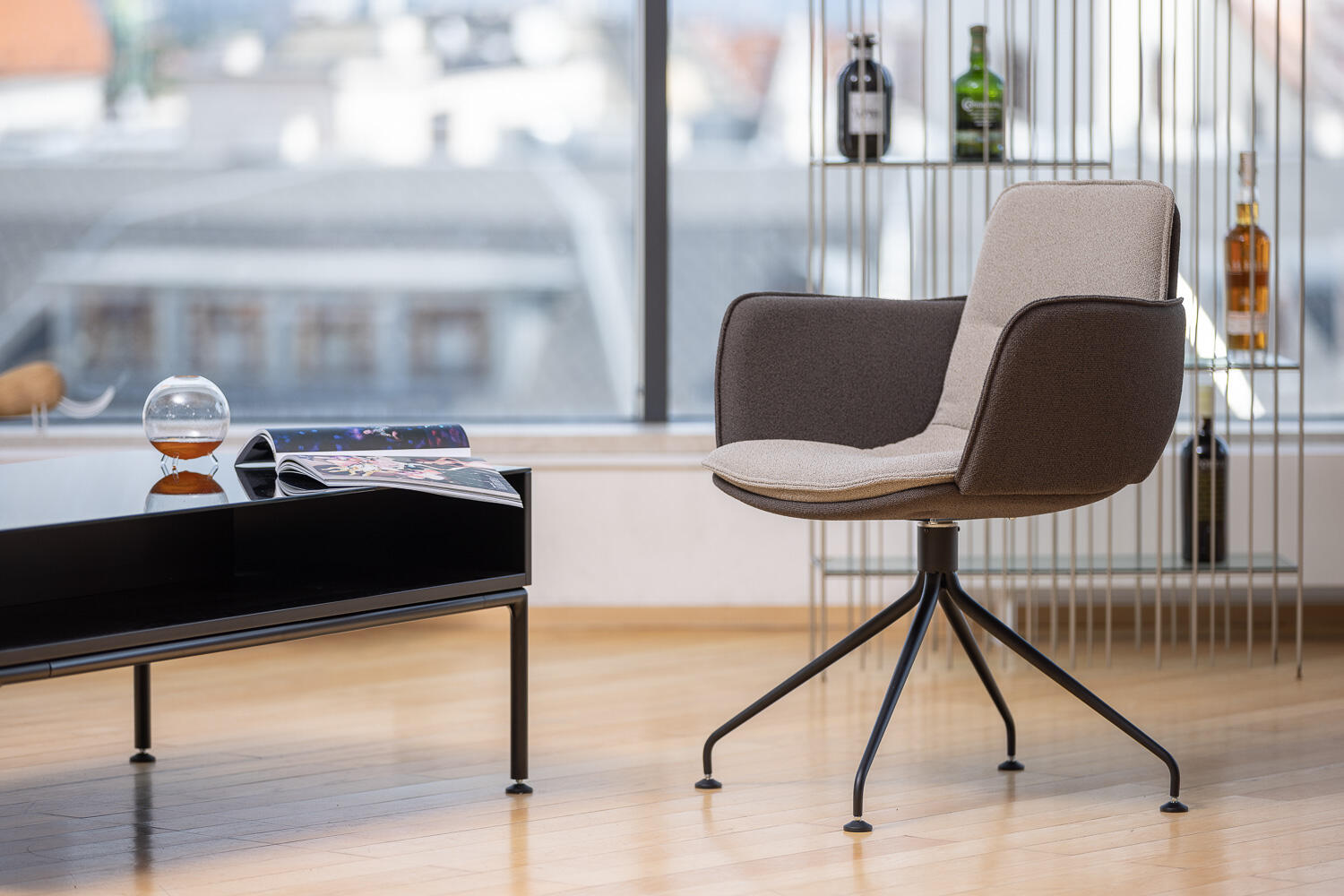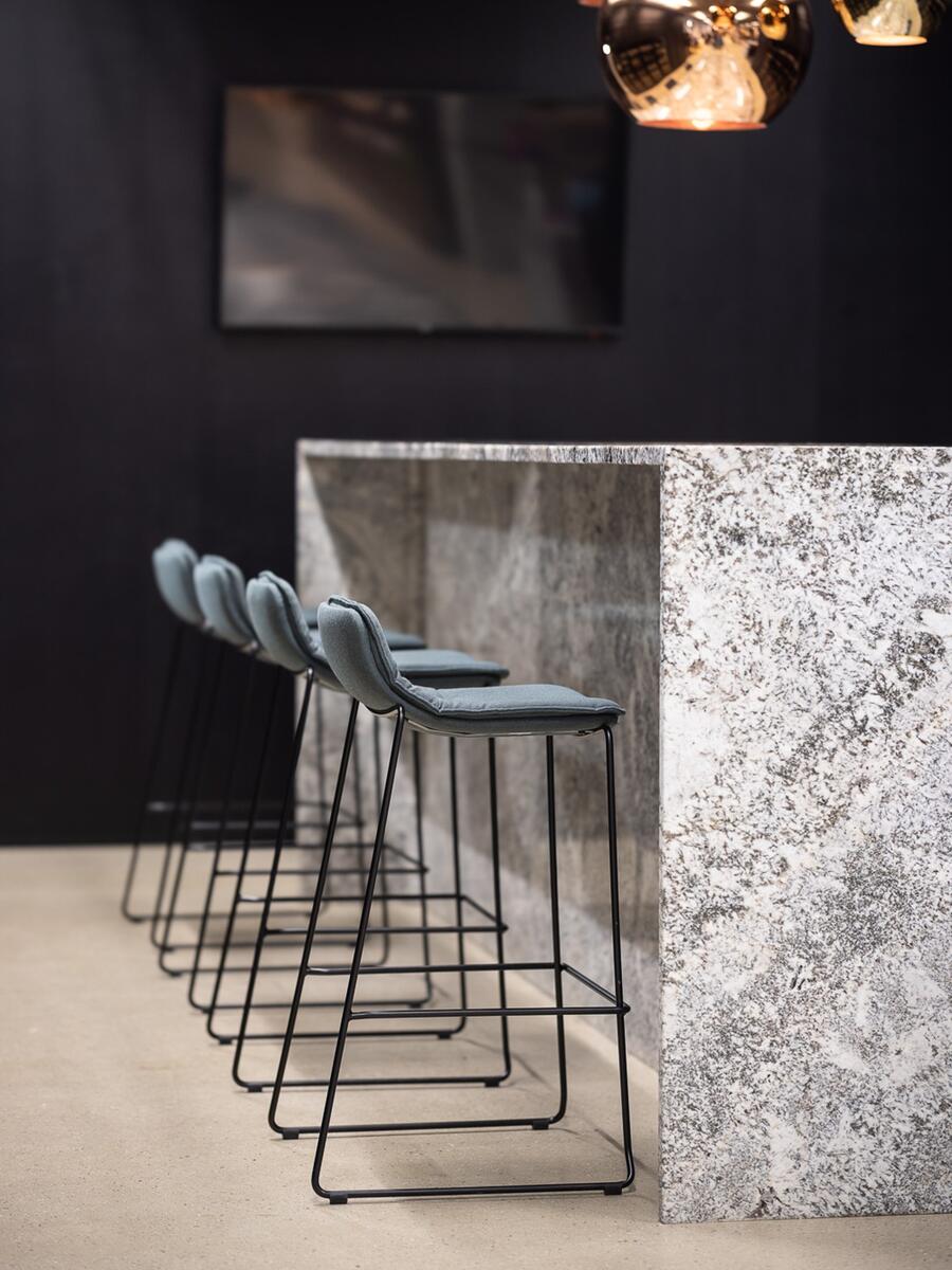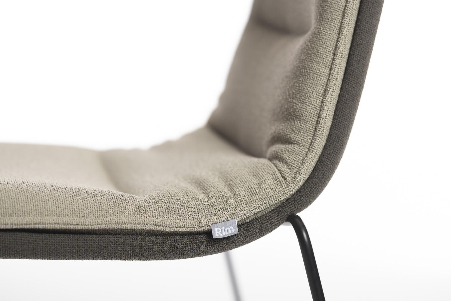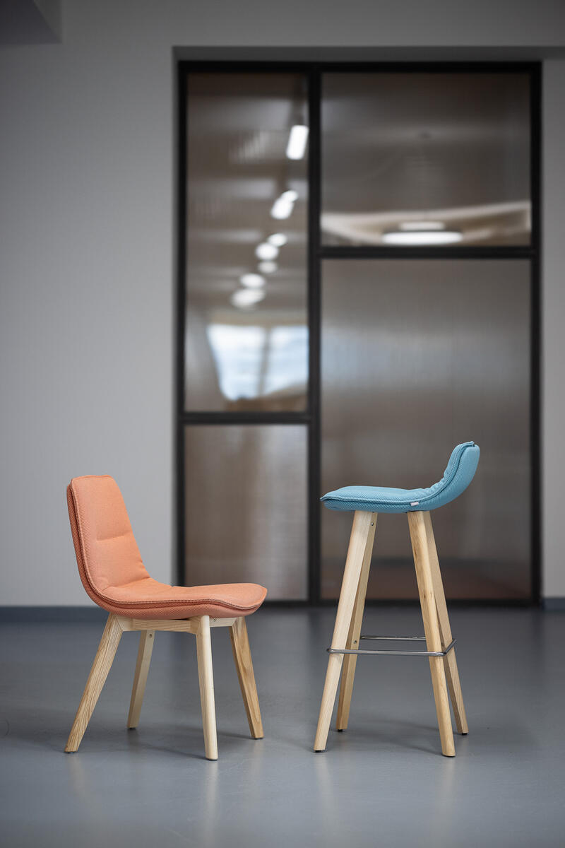 Playfully undulated upholstery makes the two-piece shell, each upholstered of its own, stand out.