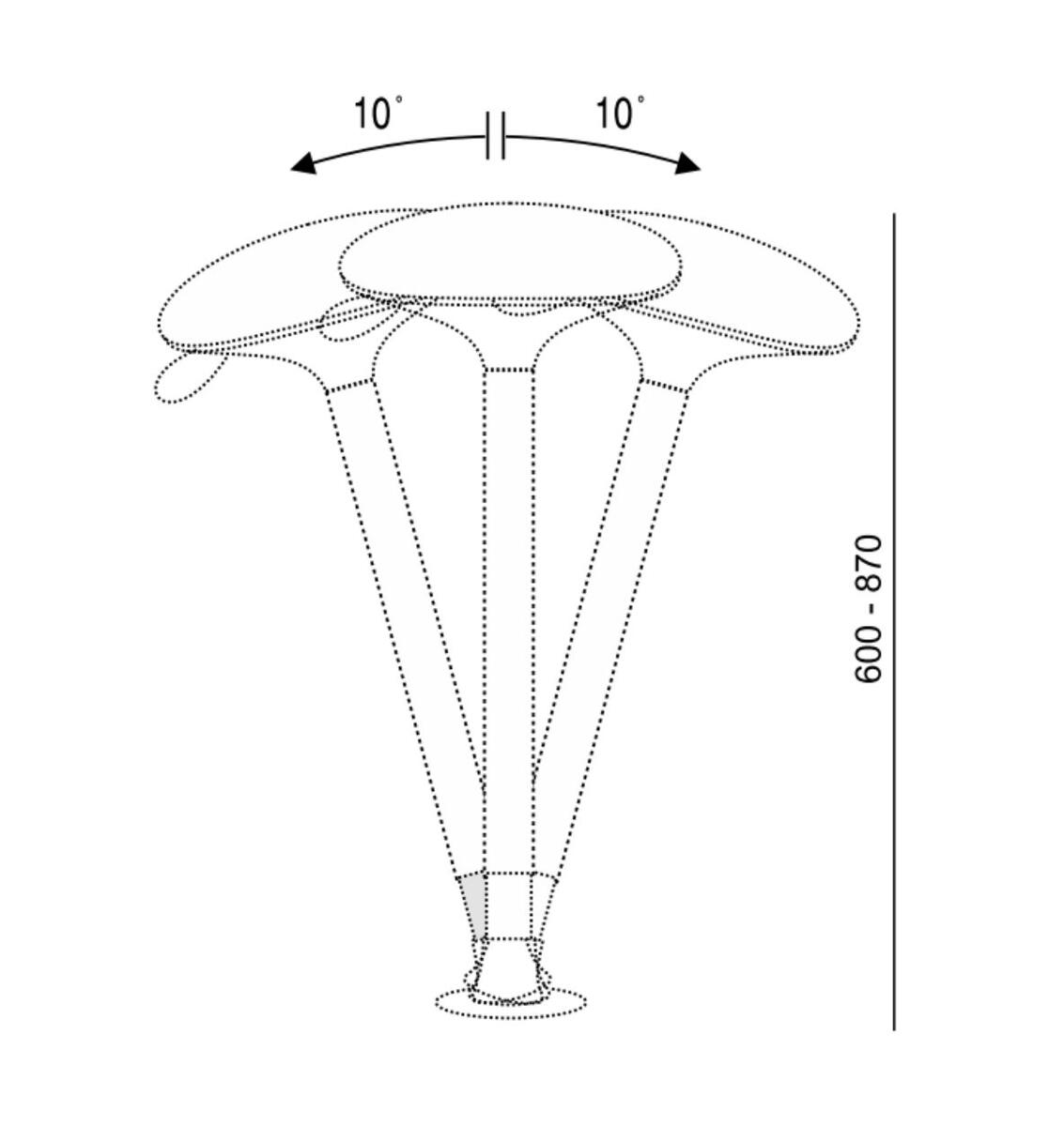 Upholstered seat. • Metal tube with gas unit, cast iron round base Ø 400 mm with a tilting joint and anti-slip surface. • Height adjustment 600-870 mm, controlled by a leather strap located under the seat. • Rotational movement 360°, side tilt up to 10°. • Load capacity up to 130 kg.