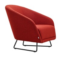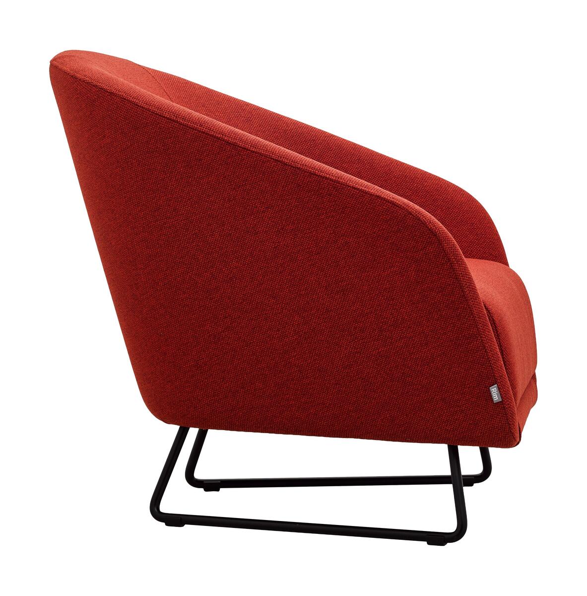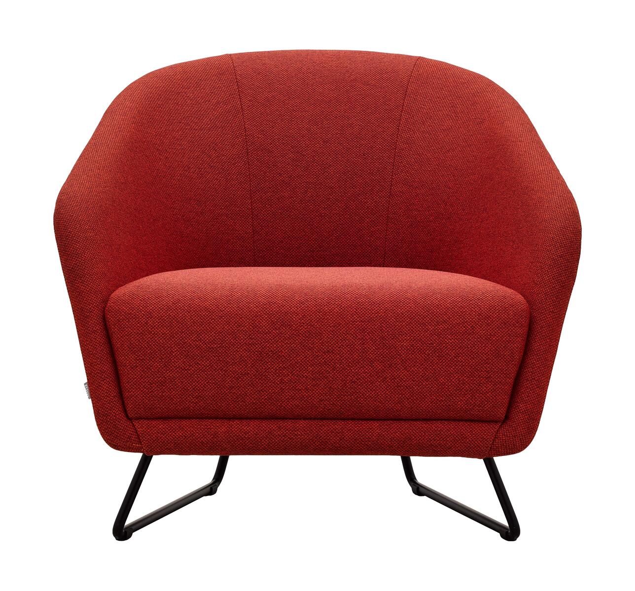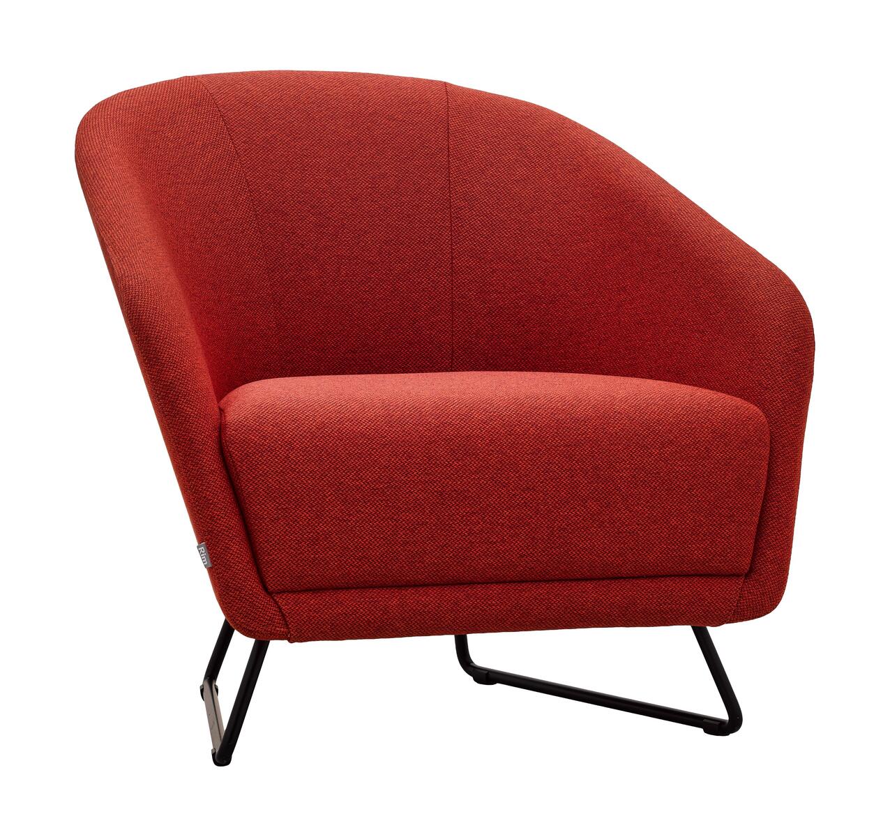 Fully upholstered armchair with curved shapes, offering the option to upholster the seat and backrest in three different colors. The armchair is standardly mounted on a black metal frame with plastic glides.