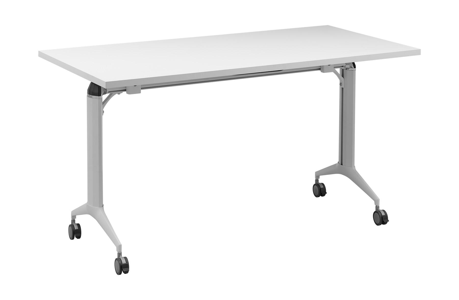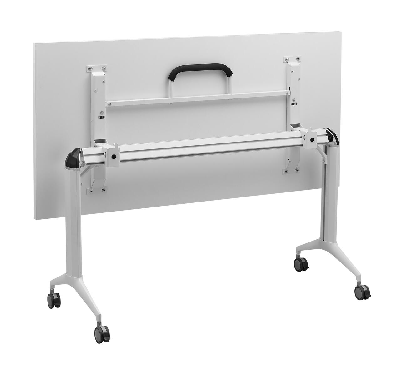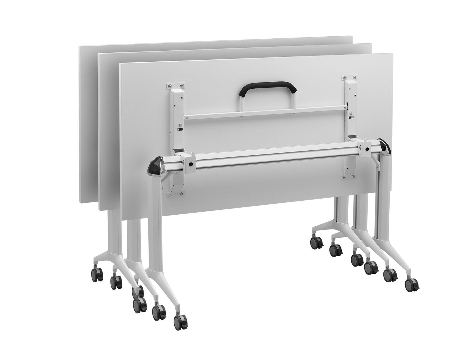 Stackable into rows folding desk on braked castors. Desks can be easily connected to one another using plastic connectors at the bottom of the table top. The desk is suitable for congress halls and other multifunctional areas requiring a quick change of the workspace layout.
