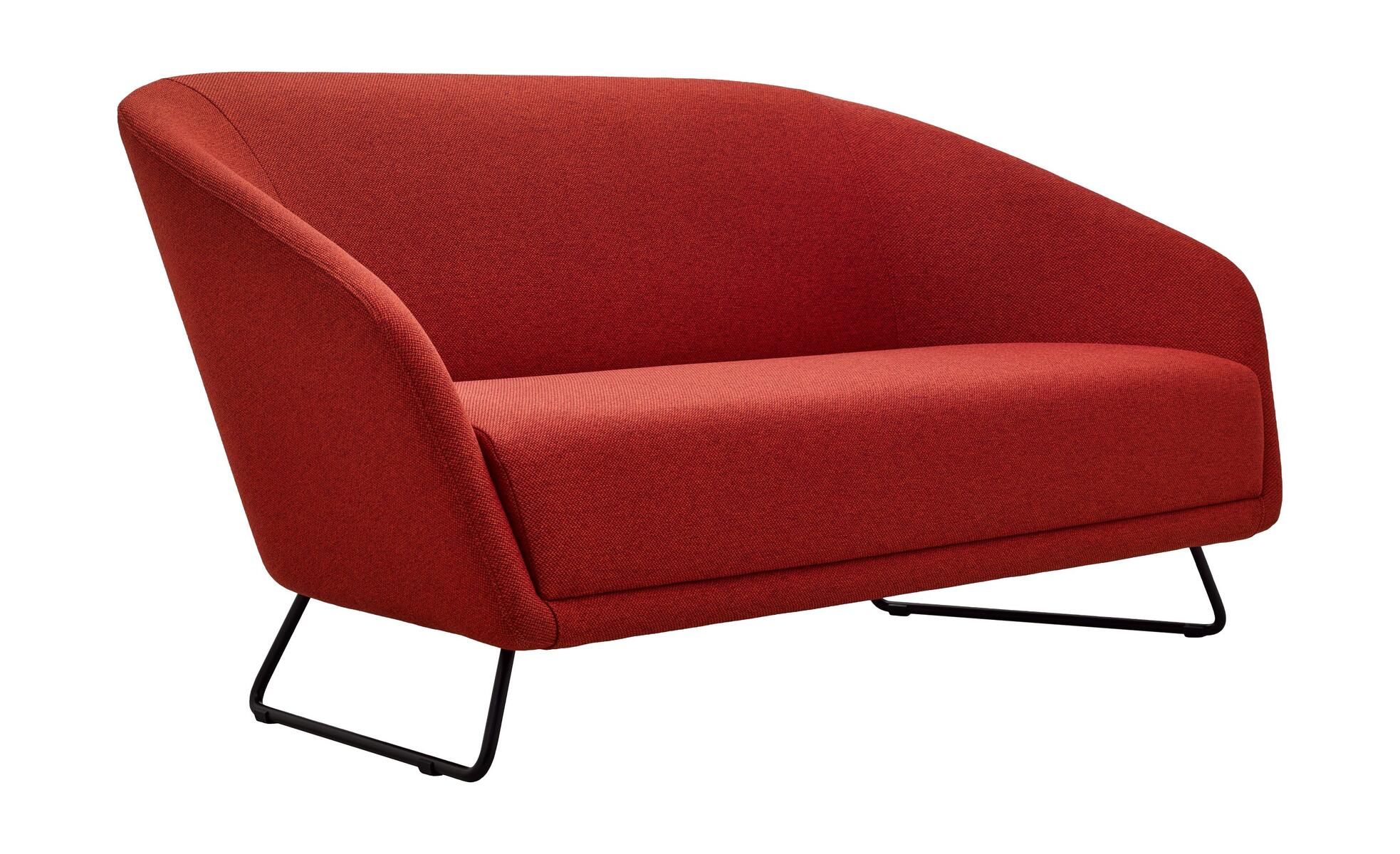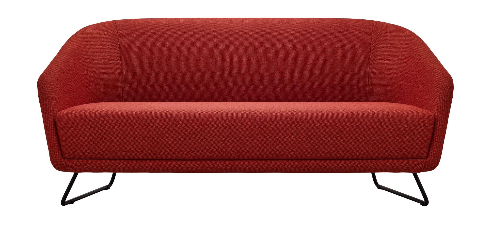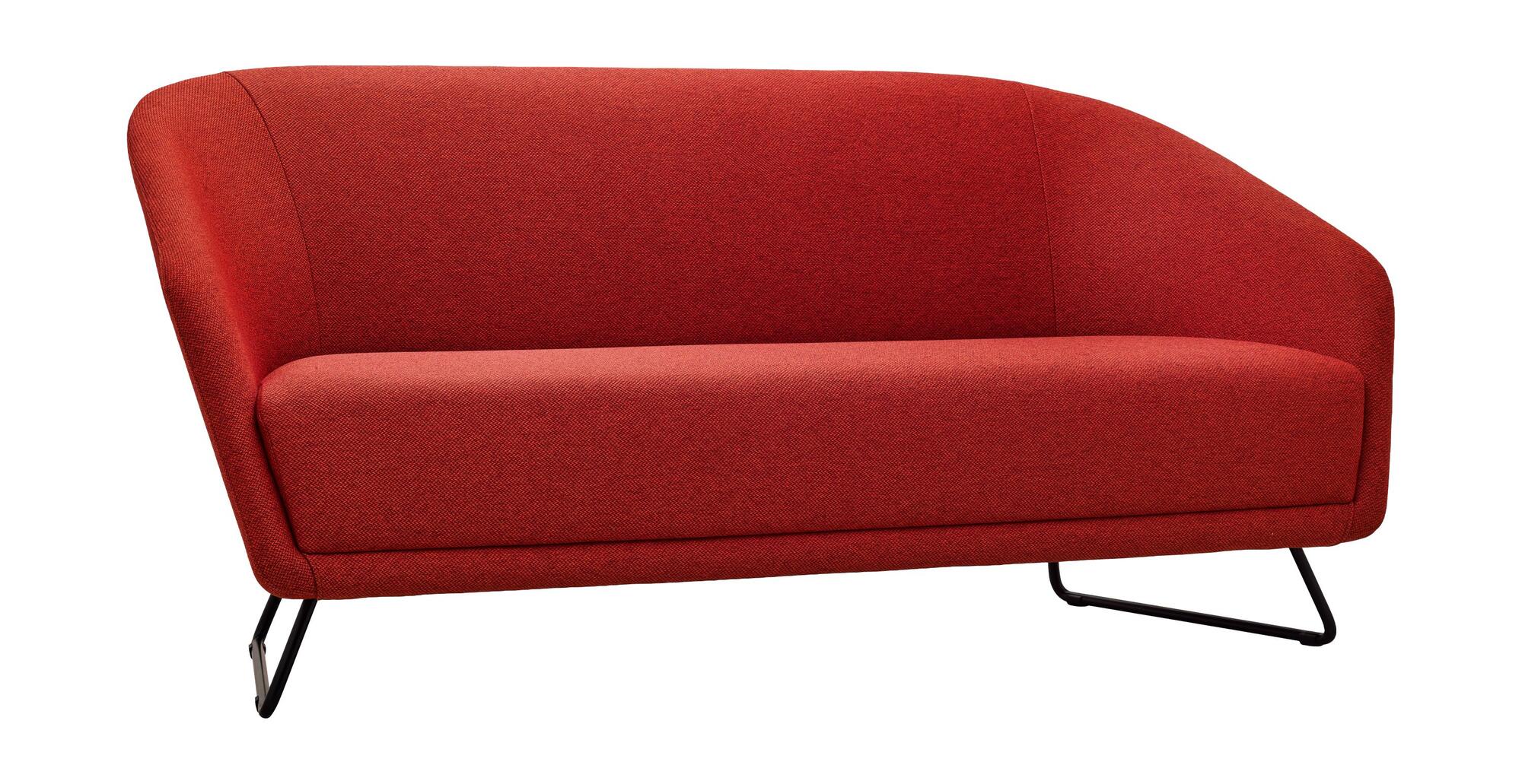 Canapé entièrement rembourré aux formes arrondies, avec la possibilité de tapisser le siège et le dossier en trois couleurs différentes. Le canapé est monté sur un cadre métallique noir avec des patins en plastique.