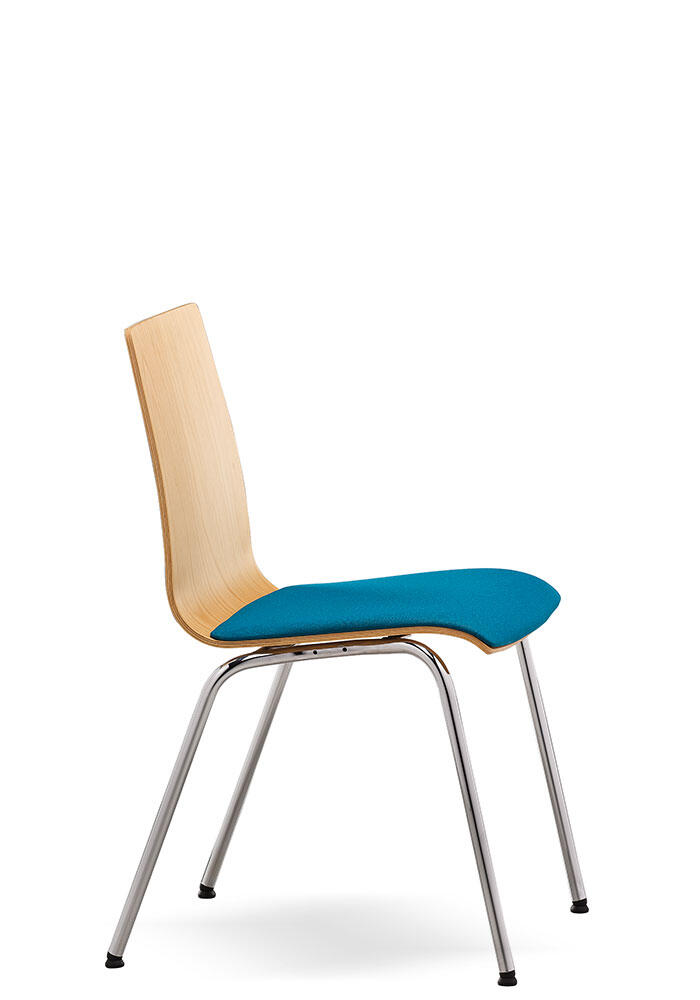 Chaise empilable en bois avec l'assise rembourrée sur la structure 4-pieds. La chaise est équipée d'une protection en plastique en dessous pour éviter de rayer le siège lors de l'empilage. Le siège SITTY peut être équipé d'un tablette d'écriture, une ouverture de manipulation dans le dossier, des connecteurs d'accrochage en rangée et des éléments de rattachement au sol.