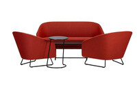 Canapé entièrement rembourré aux formes arrondies, avec la possibilité de tapisser le siège et le dossier en trois couleurs différentes. Le canapé est monté sur un cadre métallique noir avec des patins en plastique.