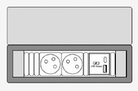 Připojovací panel – 2x 230 V (typ E), nabíječka 1x USB-A/C (65W). Napájecí kabel 2 bm s vidlicí CEE E/F. Korpus černý plast, kovový rámeček v černém provedení. Alu krytka. Volitelný doplněk PM 020.01 — Připojovací panel 2x 230V (typ F)