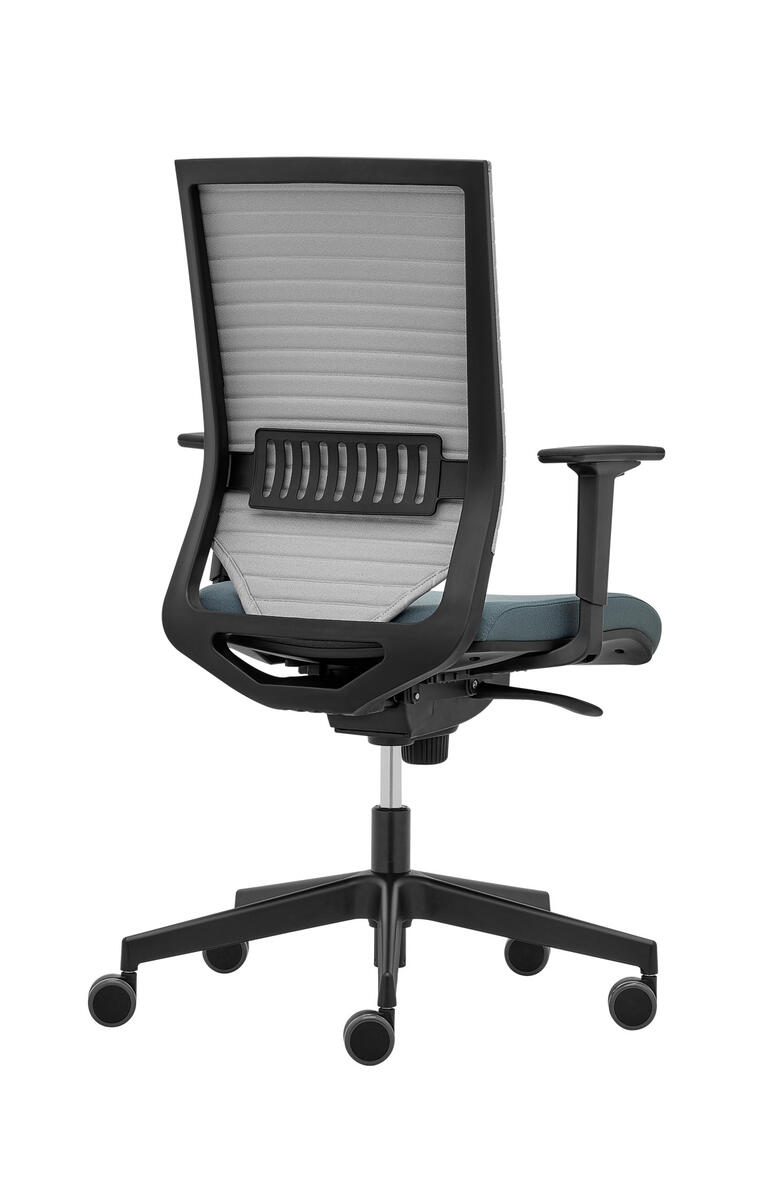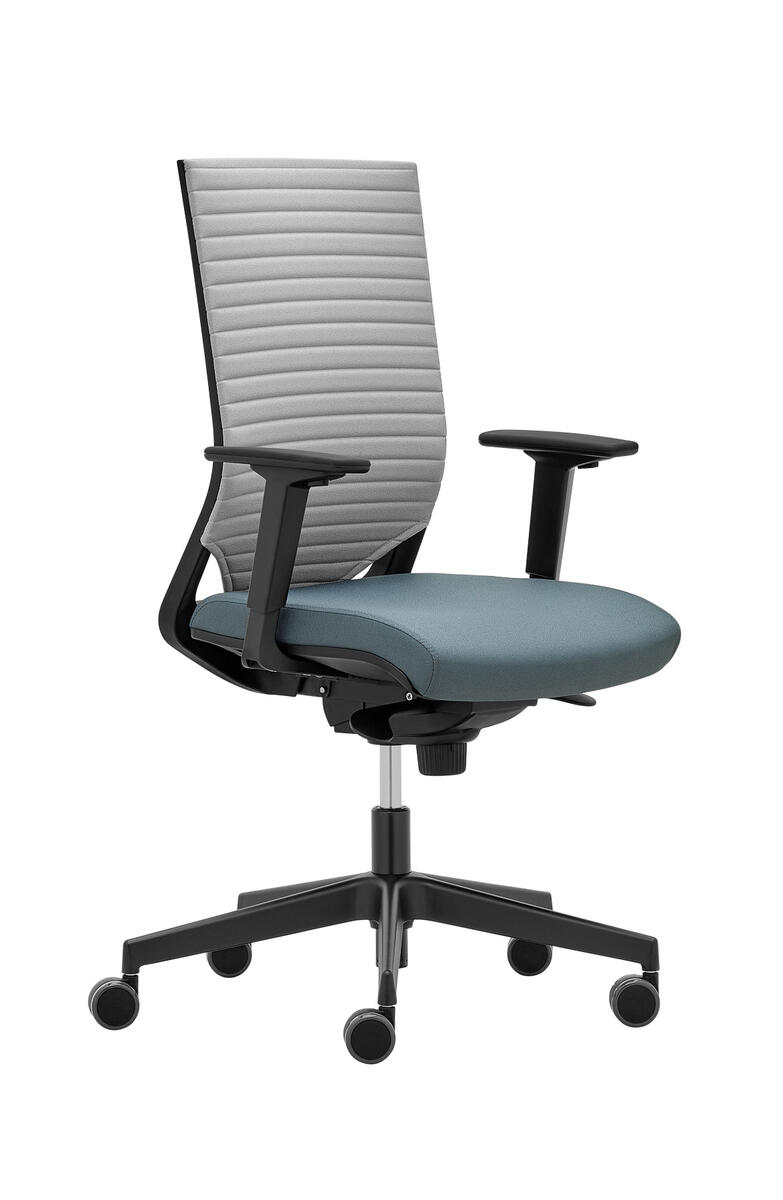 Otočná kancelářská židle s konstrukcí odděleného čalouněného sedáku a fixní zádové opěry, čalouněné speciální látkou LINE, s možností výškově stavitelné bederní podpěry. Židle je vybavena synchronní mechanikou ST5 a splňuje nároky na snadné ovládání, údržbu a servis.