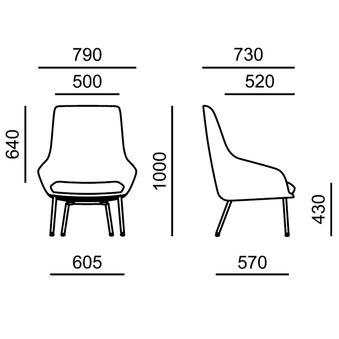 Lounge křeslo KL 5306.09 s vyšší opěrou na čtyřnohé kovové podnoži.