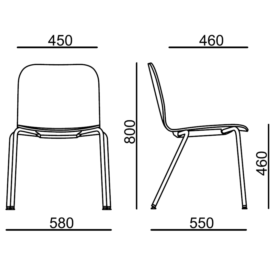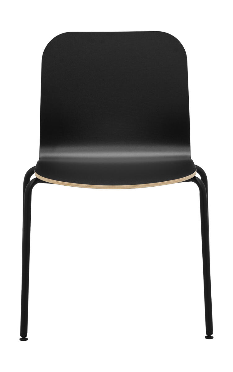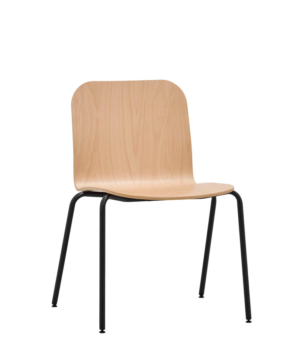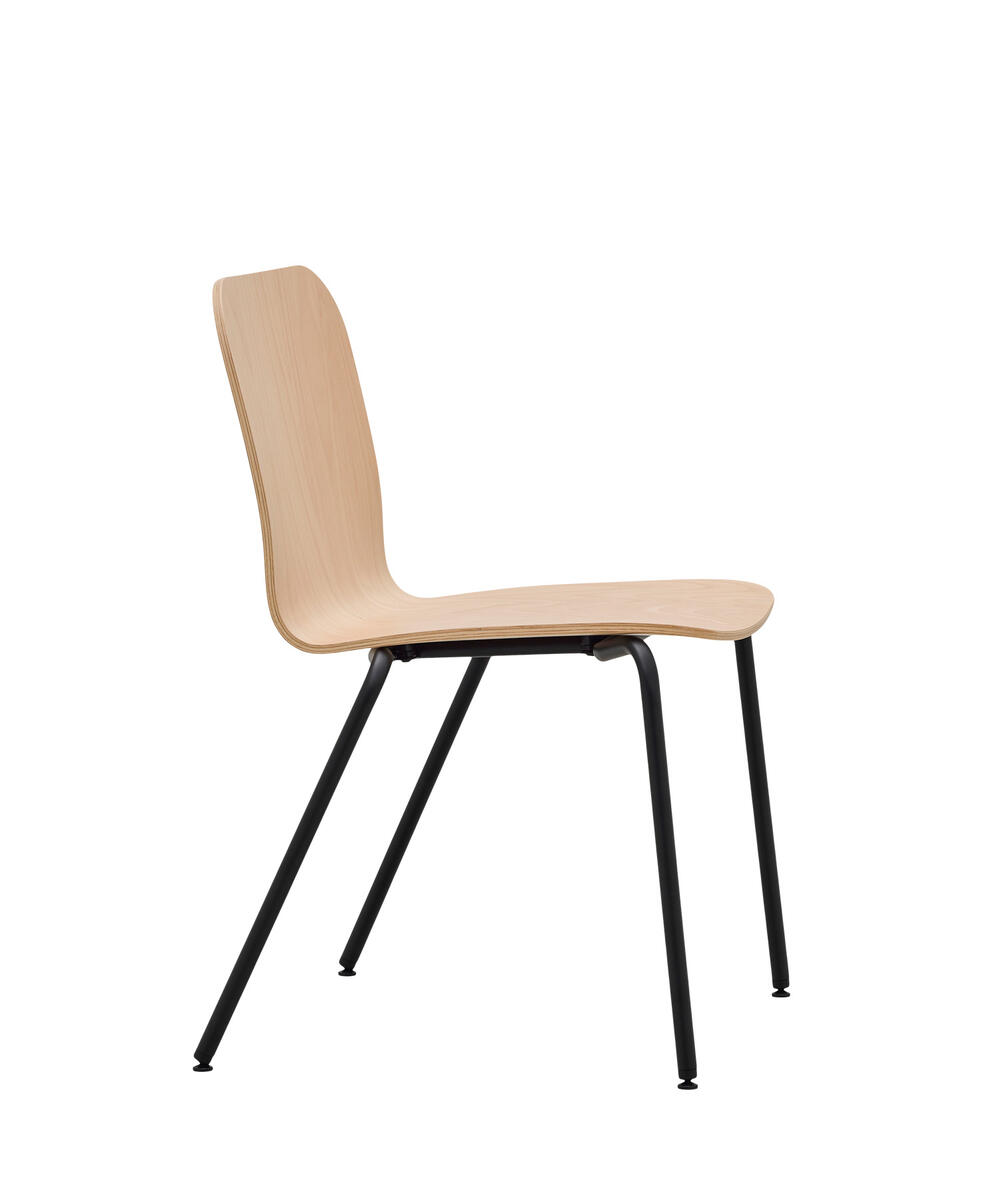 Víceúčelová stohovatelná židle, skořepina z bukového dřeva, čtyřnohá kovová podnož. Plastový kryt spodní strany sedáku zaručuje bezpečné stohování židlí bez poškození bukové skořepiny.