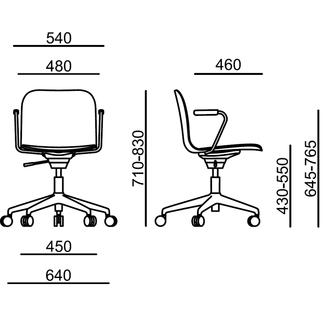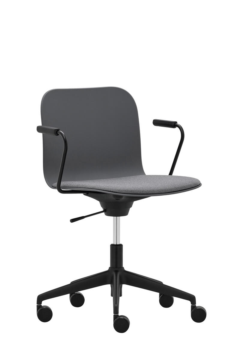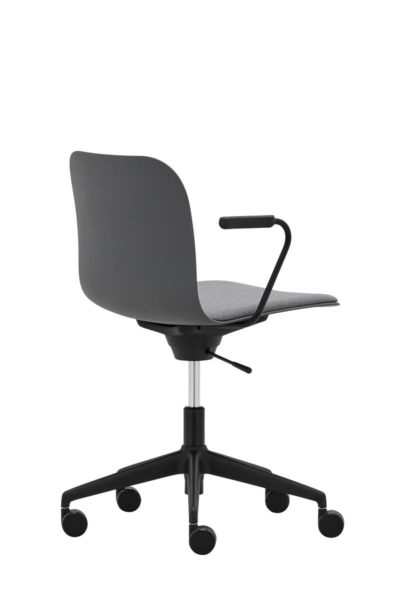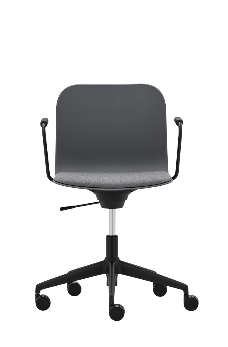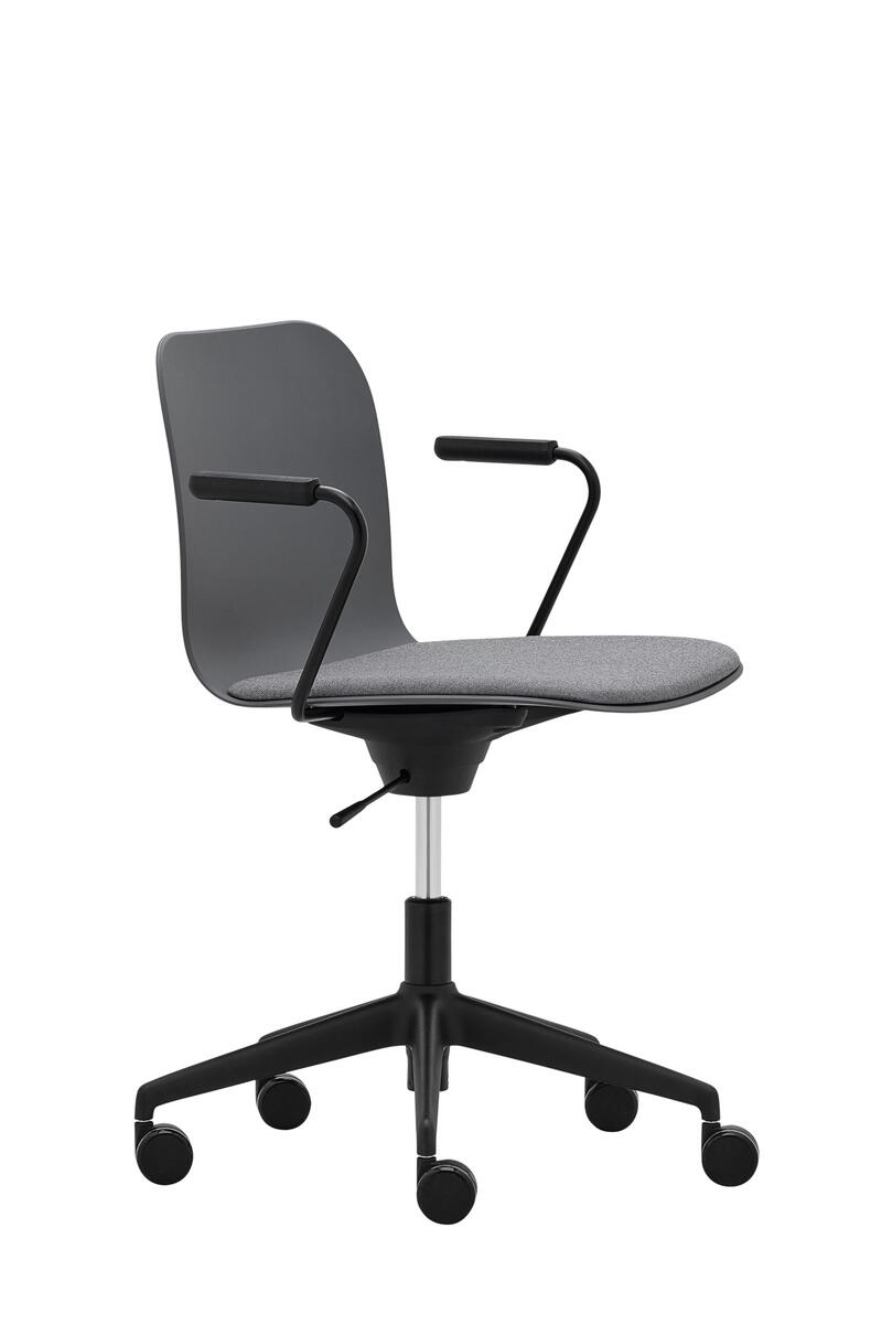 Víceúčelová židle s područkami a čalouněným segmentem sedáku, vybavená otočným houpacím mechanismem s nastavením výšky. Plastová skořepina (PP), pětiramenný kříž na kolečkách.