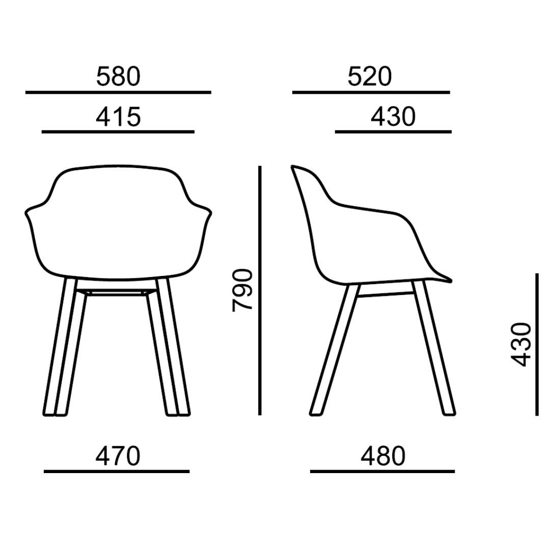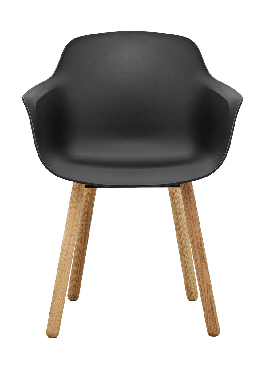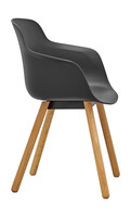 Víceúčelová židle, celoplastová skořepina s područkami, čtyřnohá dřevěná podnož.