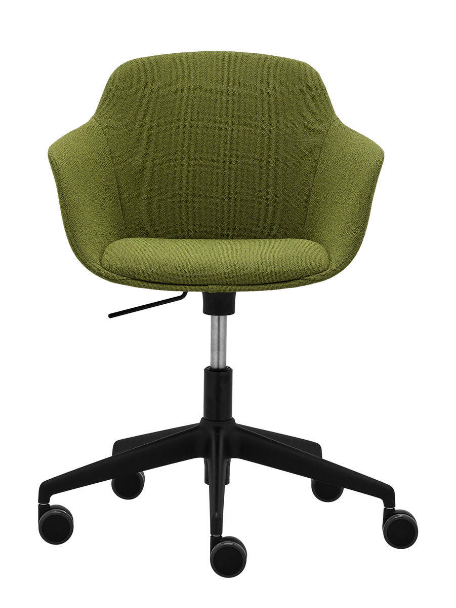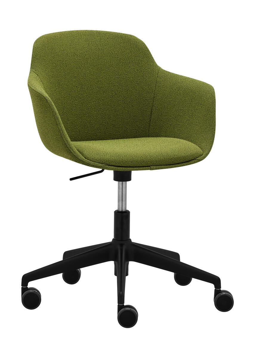 Víceúčelová výškově stavitelná otočná židle, celočalouněná plastová skořepina s područkami, čalouněný segment segáku pro zvýšený komfort, černý pětiramenný plastový kříž s kolečky.