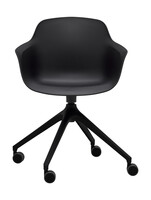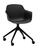 Víceúčelová výškově stavitelná židle, celoplastová skořepina s područkami, na černé otočné čtyřramenné podnoži s kolečky.
