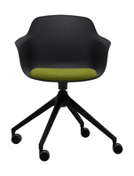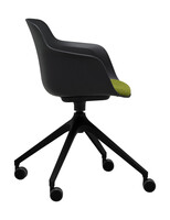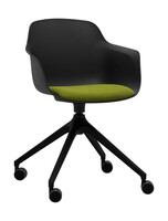 Víceúčelová židle, celoplastová skořepina s područkami, čalouněný segment segáku, na černé otočné čtyřramenné podnoži s kolečky.