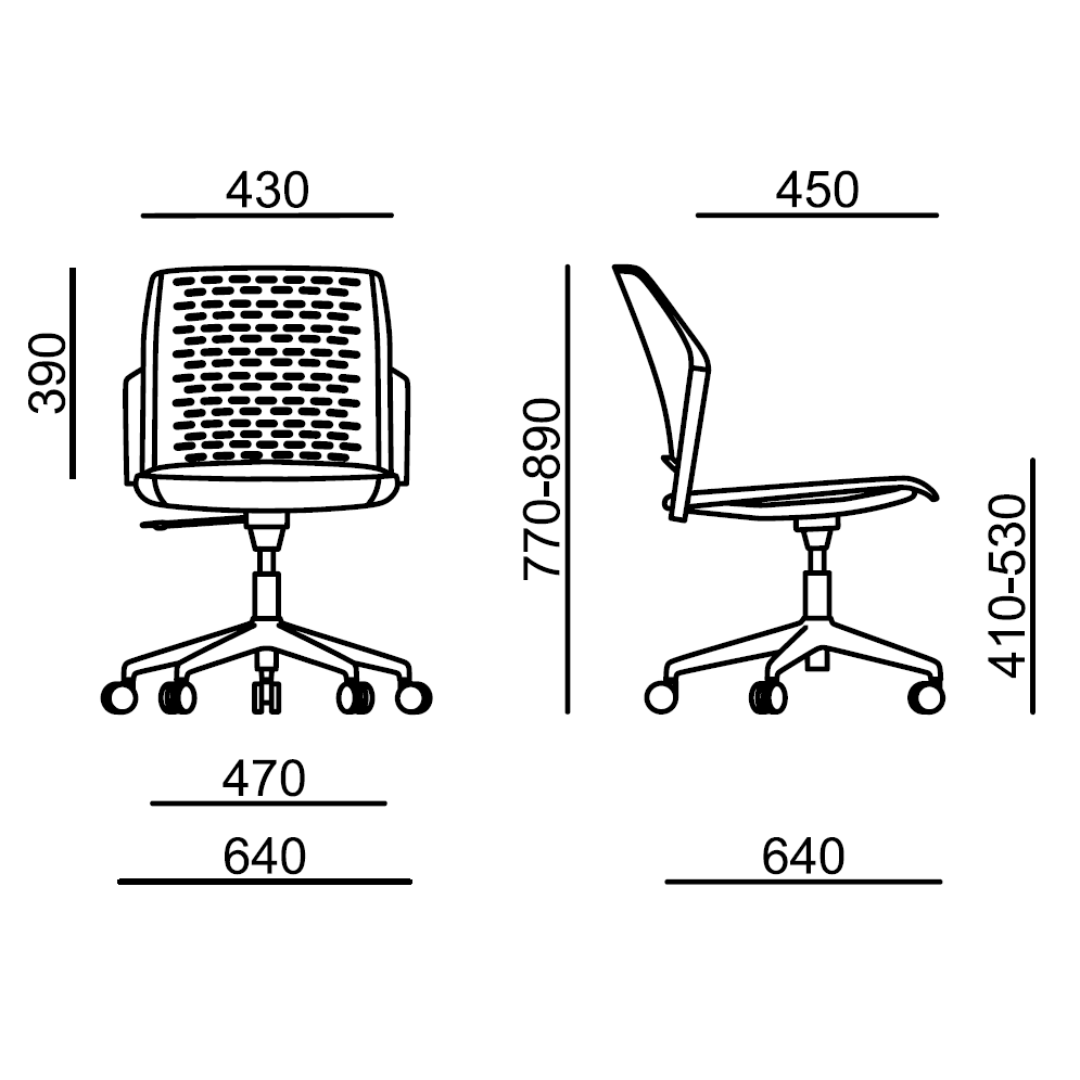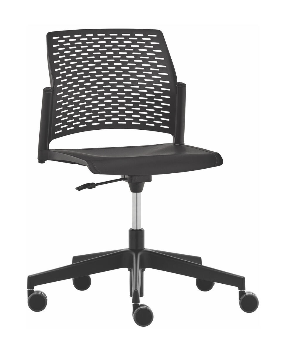 Celoplastová, výškově stavitelná konferenční židle s otočným mechanismem (SW+) na pětiramenném kříži s kolečky.