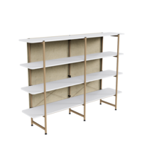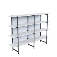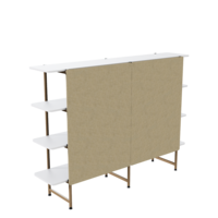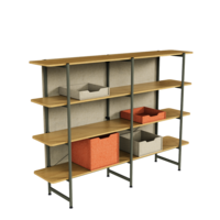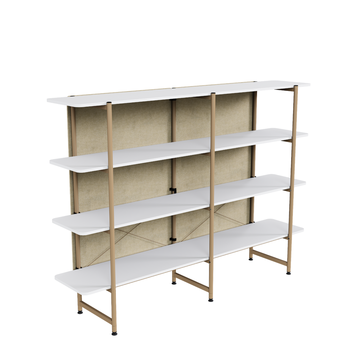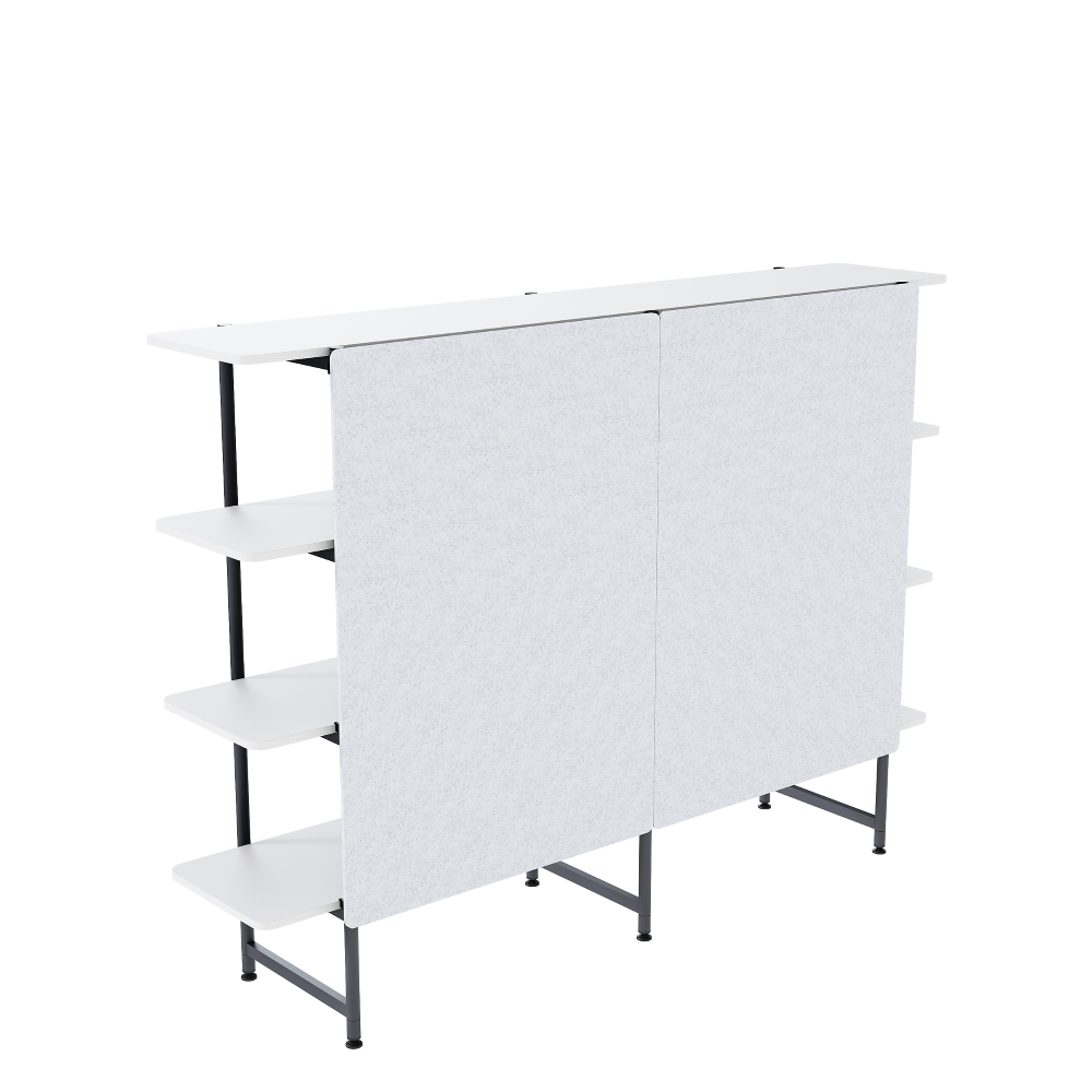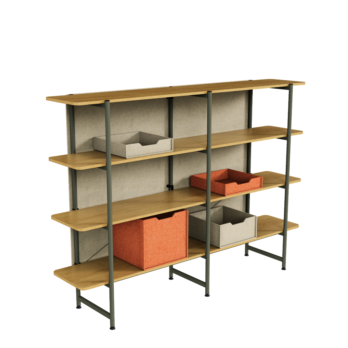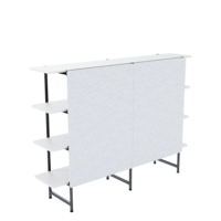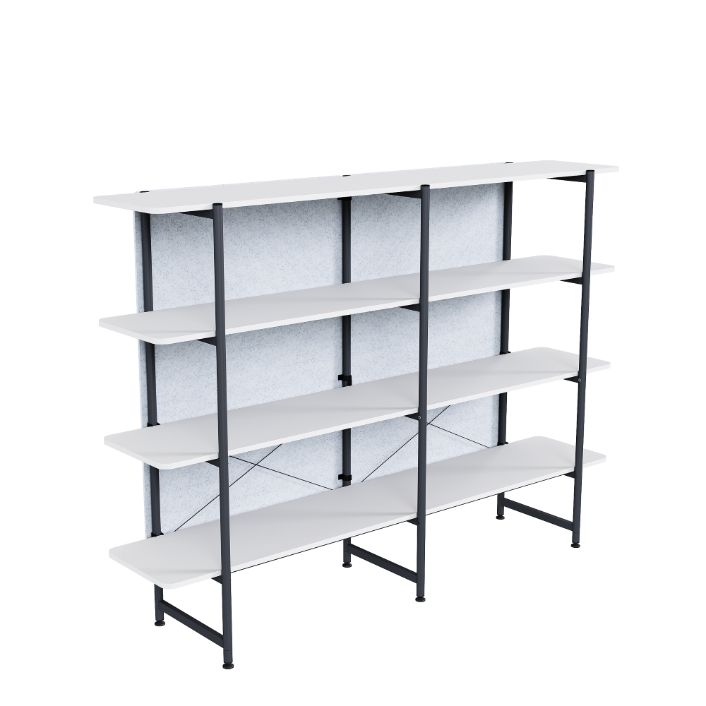 Čtyřpatrový regálový systém s možností doplnění PET panelu pro větší soukromí a lepší akustické vlastnosti. Ideální řešení pro kanceláře, kde pomáhá oddělit pracovní místa a zlepšit akustický komfort. Dvojitá varianta pro rozšířené úložné a dělící možnosti.