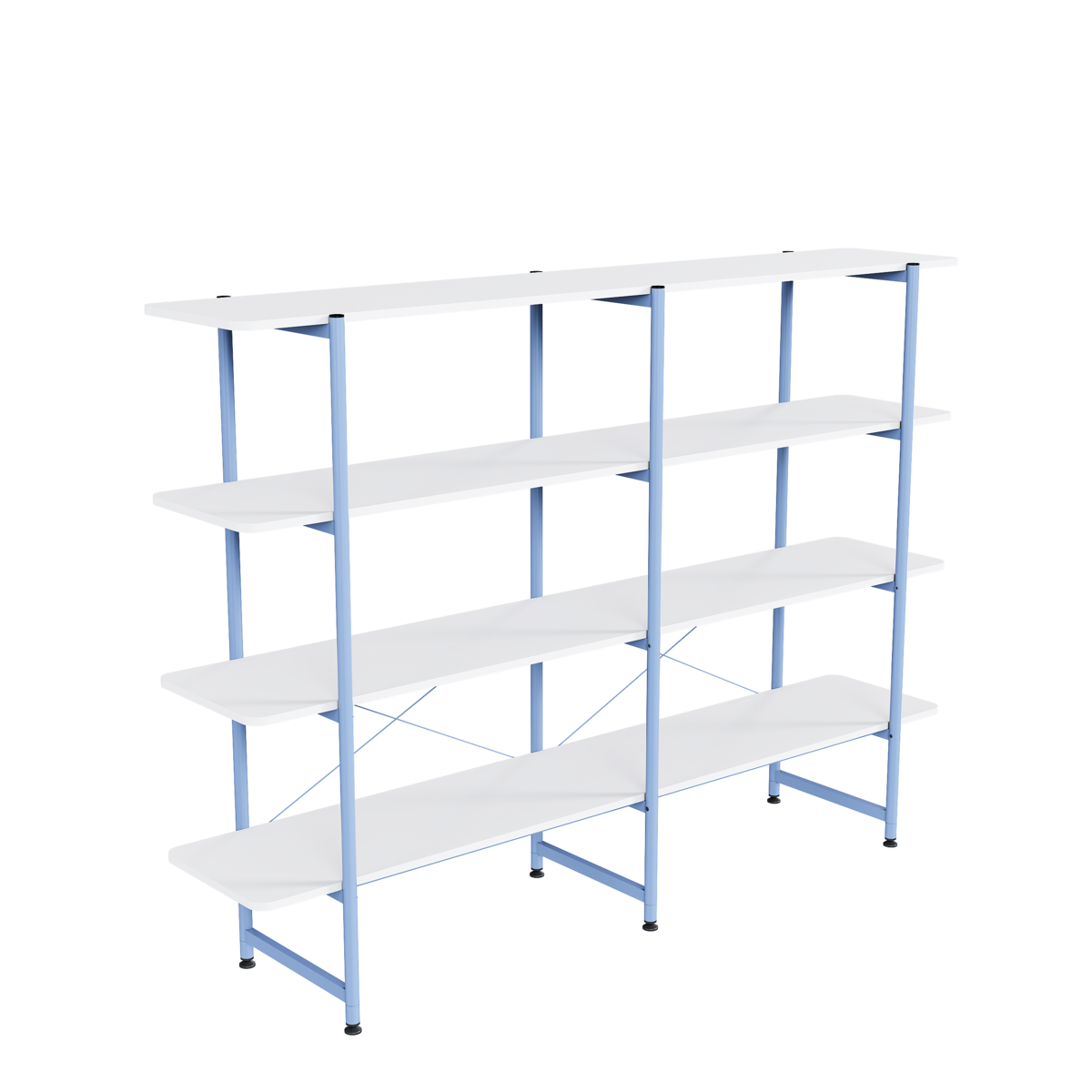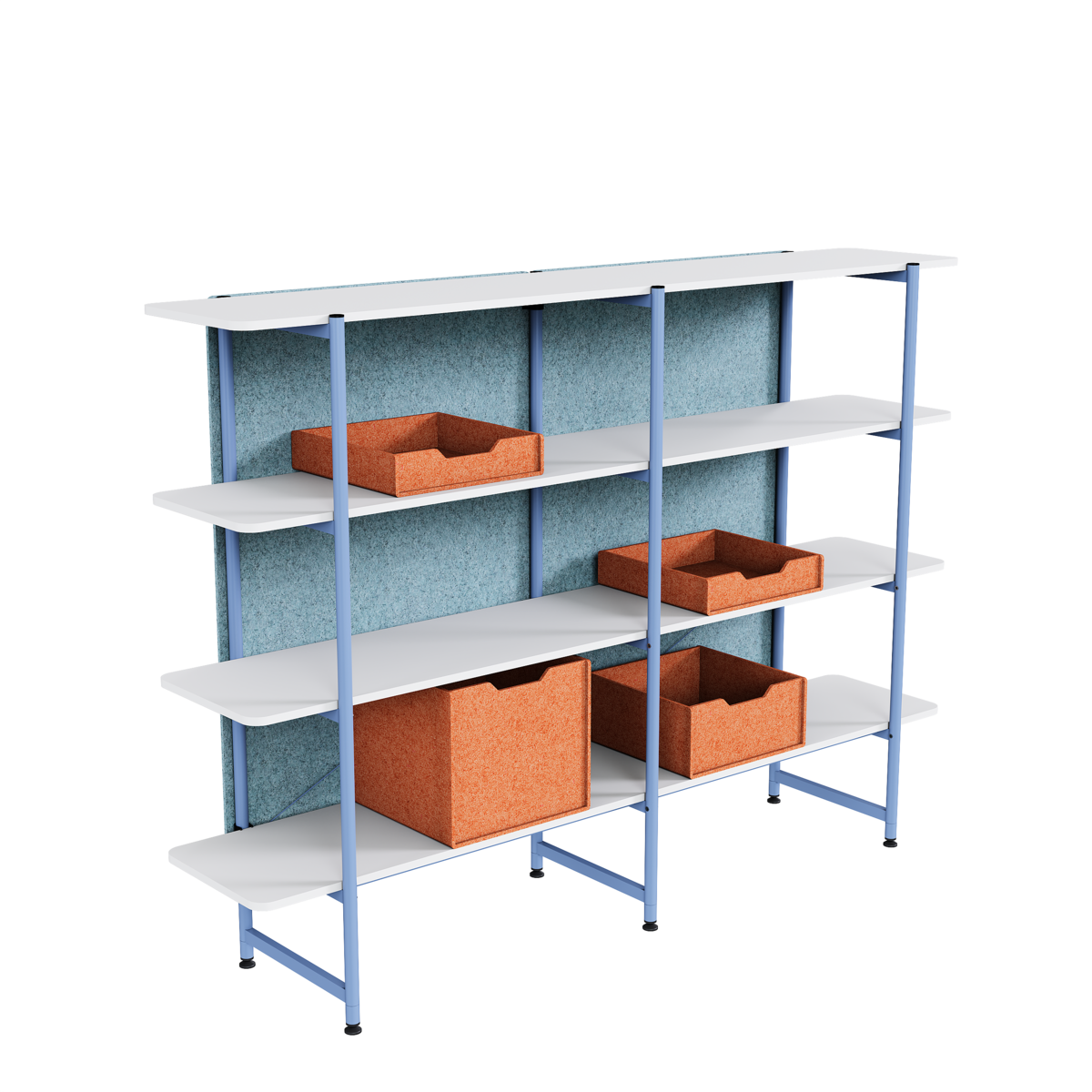 Čtyřpatrový regálový systém s možností doplnění PET panelu pro větší soukromí a lepší akustické vlastnosti. Ideální řešení pro kanceláře, kde pomáhá oddělit pracovní místa a zlepšit akustický komfort. Dostupný také ve dvojité variantě pro rozšířené úložné a dělící možnosti.
